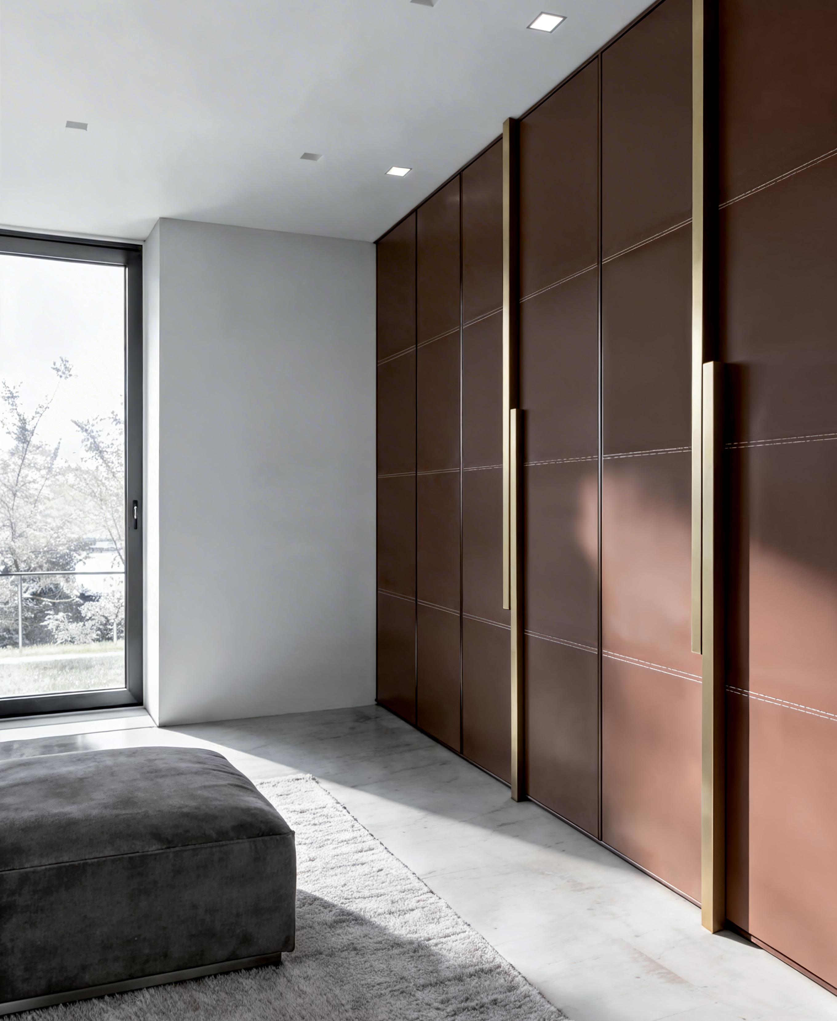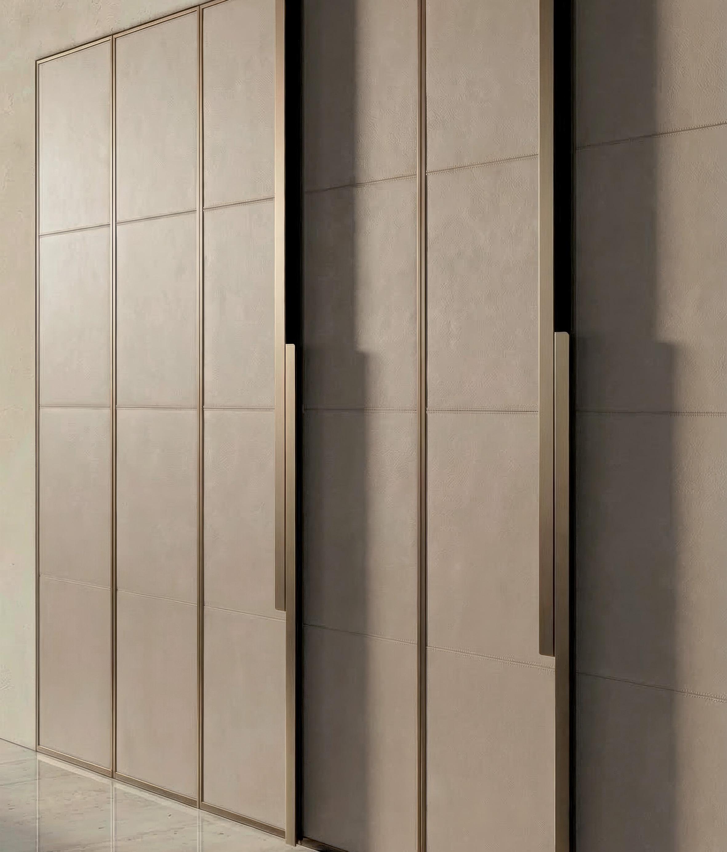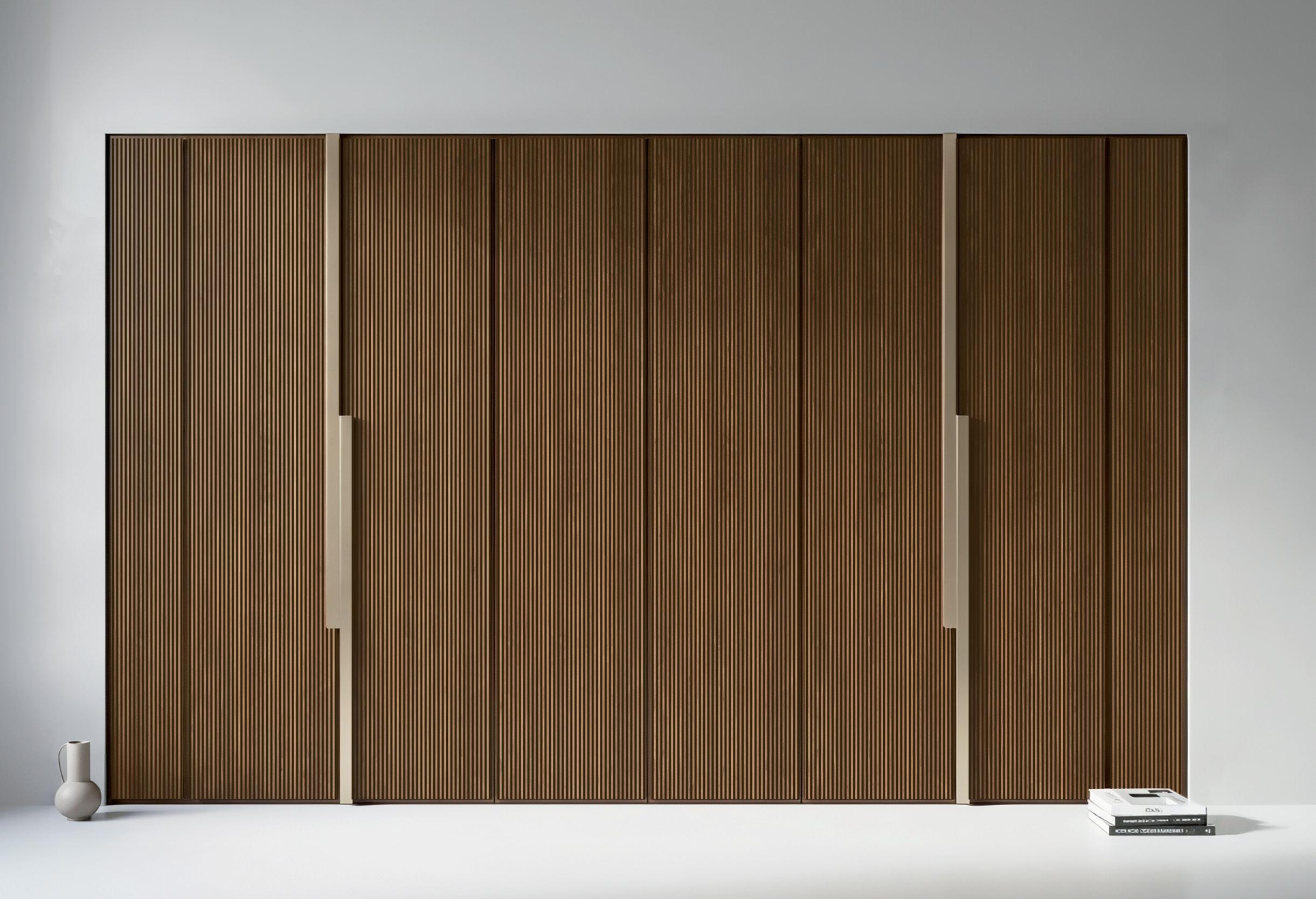 The structures are made of lacquered MDF or solid-color melaminecoated MDF.The doors, featuring a solid Canaletto walnut frame, are available in Canaletto walnut fluted finish, matt lacquer, or hide upholstery enhanced with stitching in a coordinated thread colour. Doors can be opened via a push-pull system or with a decorative painted metal handle.