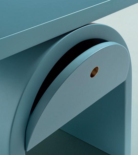 Simple geometric parts go into the Arcom bedside unit: a round arch, a horizontal top at the point of tangency, a storage compartment hidden under the arch with a flap door opening instead of a drawer. Arcom is a small work of domestic architecture that nonchalantly reinterprets traditional forms, with irony.