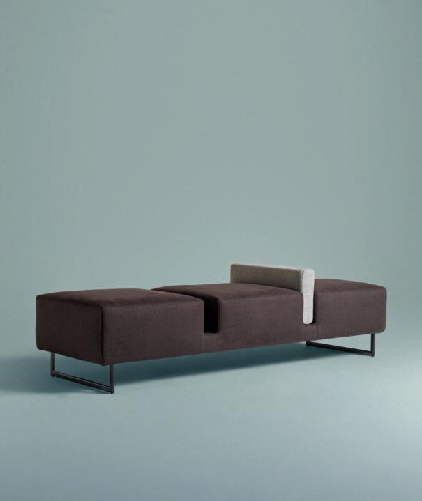 A padded one, two or three–seat bench with clean, essential lines. The housing for the (optional) cushion can also function as a place for magazines or objects. Ideal for residential and contract settings.