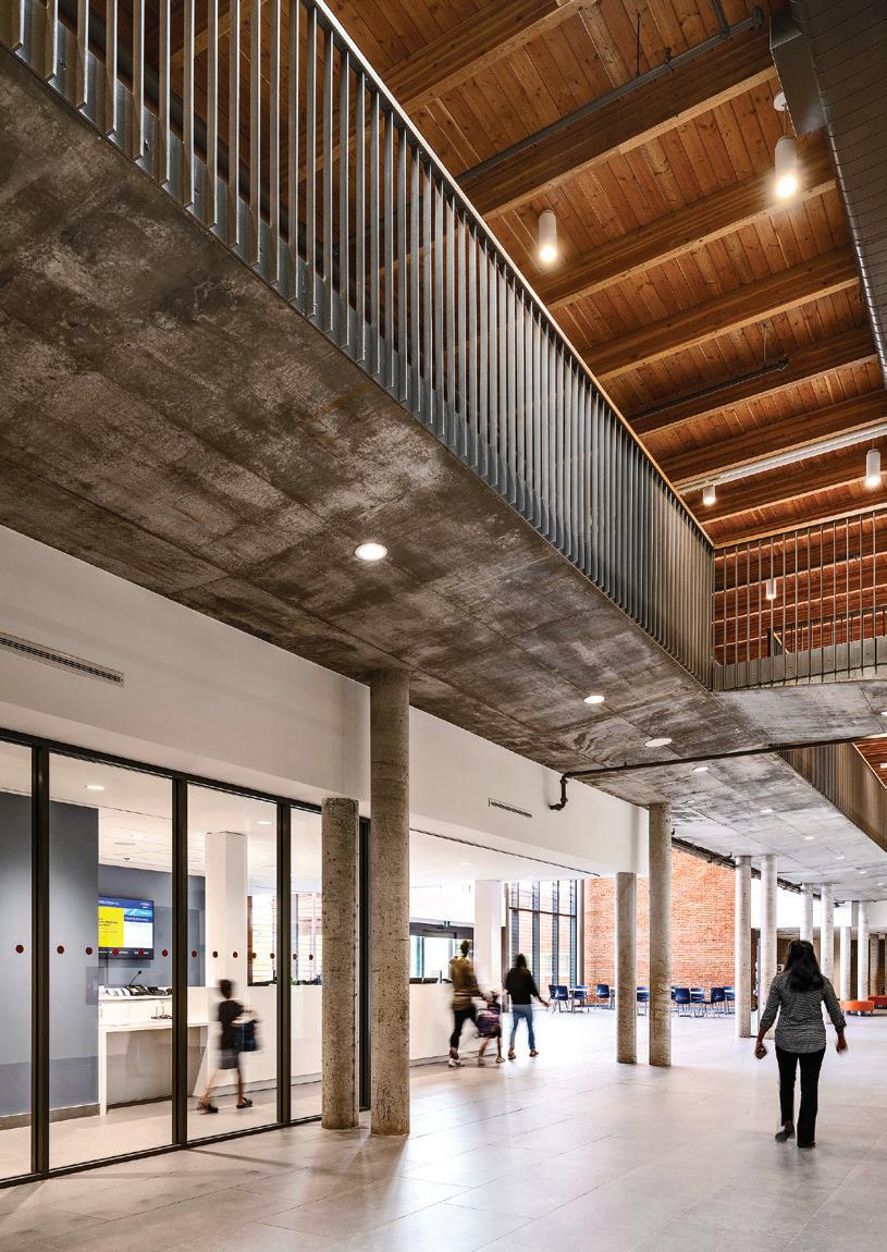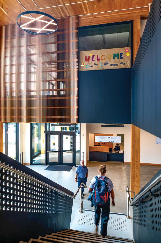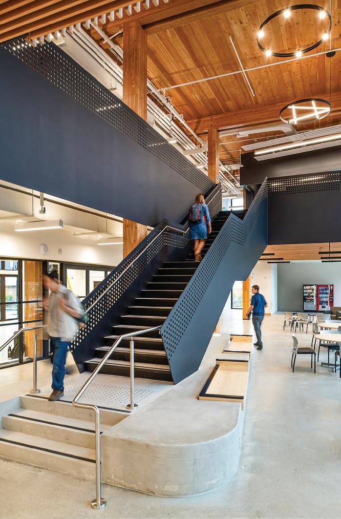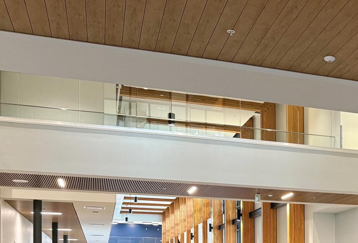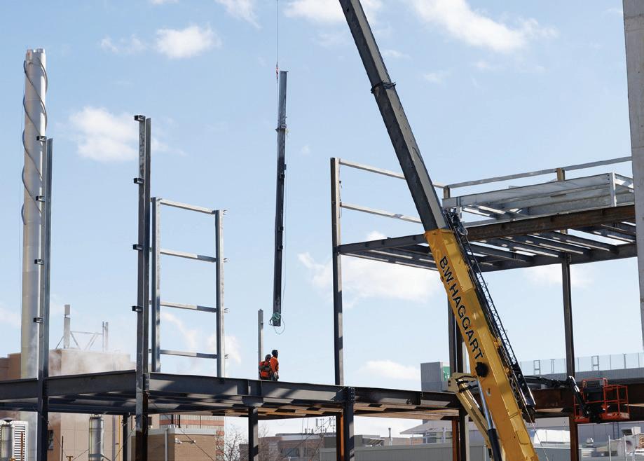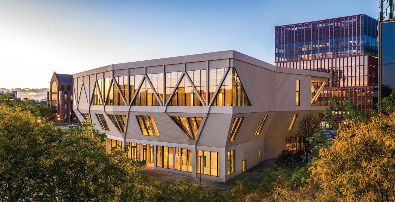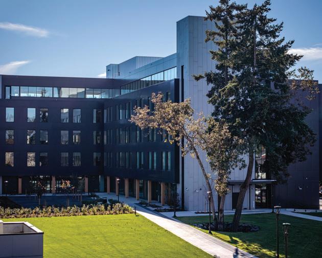 Connecting the new facility to existing campus structures was another interesting aspect. Doiel explains, “The building had to connect on three floors to existing levels, spanning between two buildings. The floor-tofloor heights were all from the 1960s, much lower than current standards, so the main challenge was co-ordinating everything while maintaining proper ceiling heights.” Boeck adds, “We also had to link the tunnels to the central utility plant at the far end of the site. With underground storage tanks and tight grades between two streets, careful planning was essential to get everything aligned.”