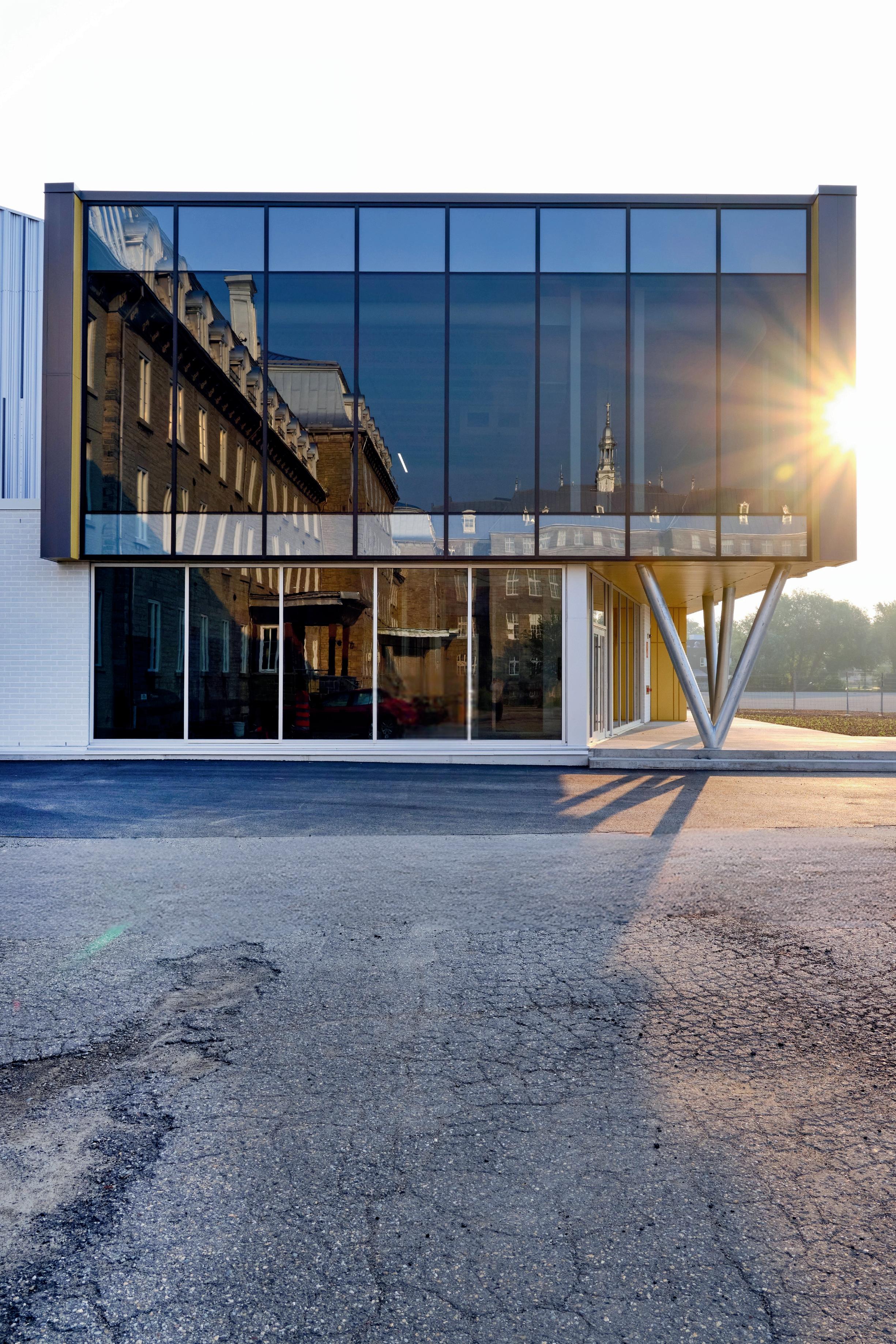 Preserving the building’s historical exterior characteristics was a central requirement. Widely regarded as an award-winning example of Modern Expressionist architecture, the building’s form and material palette have long distinguished it from conventional recreation facilities. “It was important to the project team that the rehabilitation respect the building’s historical significance,” says Everett, pointing to the facility’s origins as the former Coronation Pool and Peter Hemingway Fitness and Leisure Centre and its design by noted Edmonton architect Peter Hemingway. That architectural identity is defined by the expressive use of glass, concrete, cables, and wood, assembled into a
