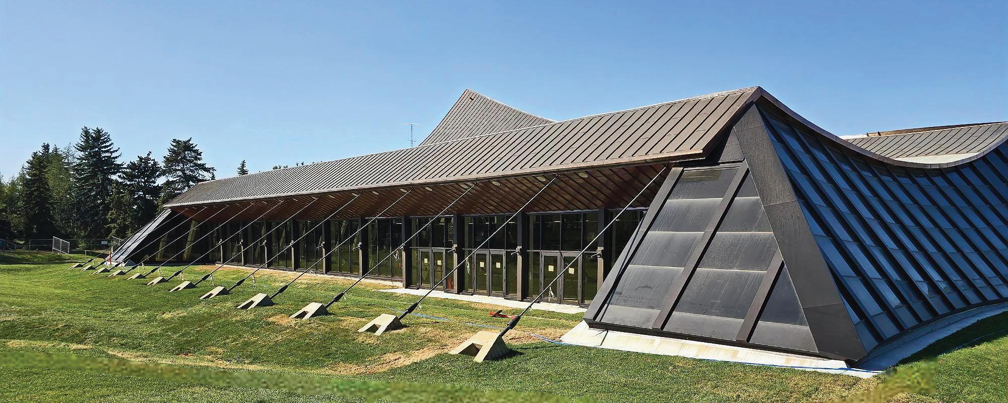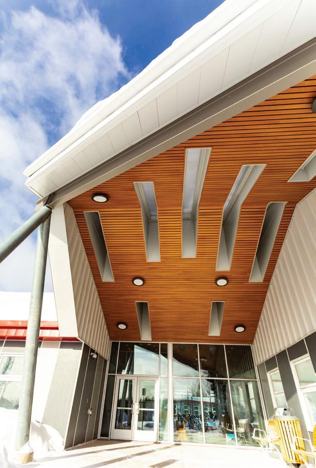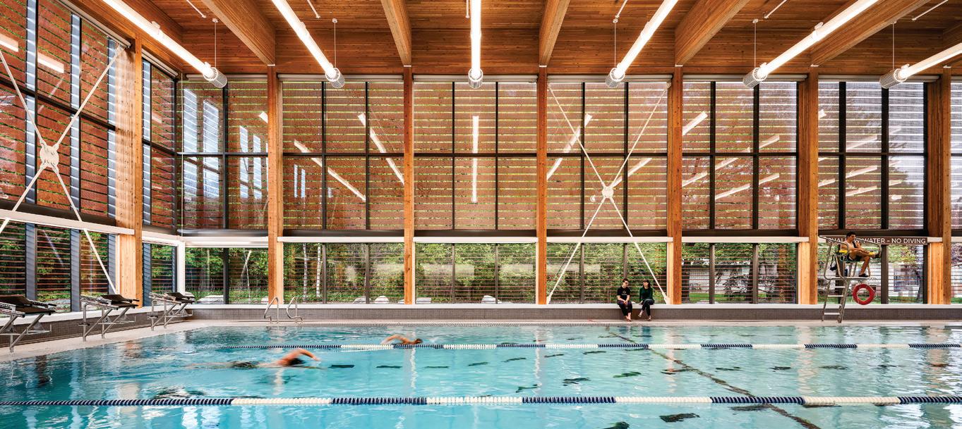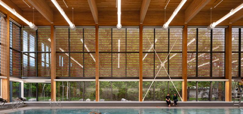 Indeed, the facility’s distinctive silhouette remains one of its defining features. “Completed in 1969, the building features swooping angles and a dramatic roof form that sets it apart from more conventional recreation facilities,” says Jason McConaghie, principal, ACI Architects. He adds that material continuity was critical to maintaining the building’s visual clarity. “The copper roof naturally oxidizes over time, taking on a darker brown tone in Western Canada,” he says. “That relationship with the bronze-anodized elements is what makes the curtain wall so prominent.”