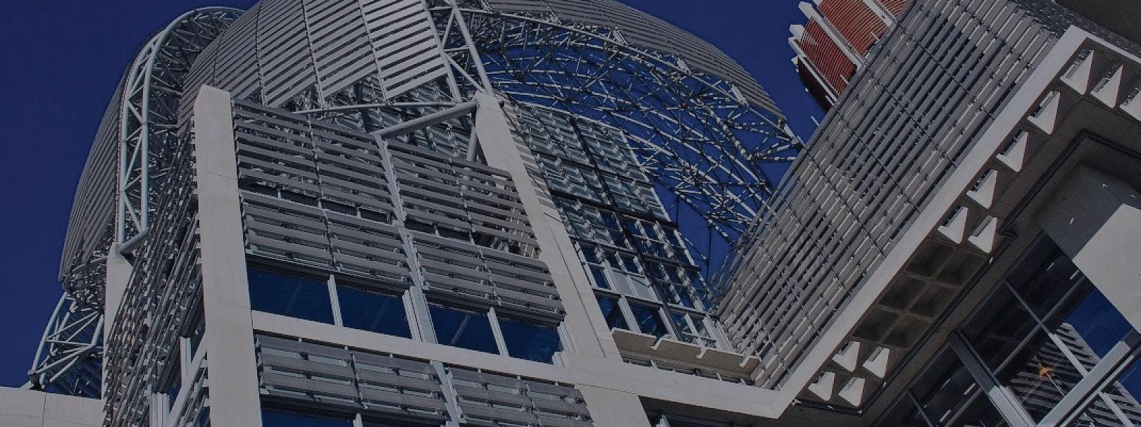 supported by a series of steel trusses that vary in depth and consist of wide-flange chords. The trusses are supported by a built-up curving girder (ring beam) at the perimeter of the roof; V-shaped circular hollow structural section columns and four concrete stair cores on the north and south ends of the roof in turn support this girder. Essentially, the columns and stair cores support the entire roof structure.