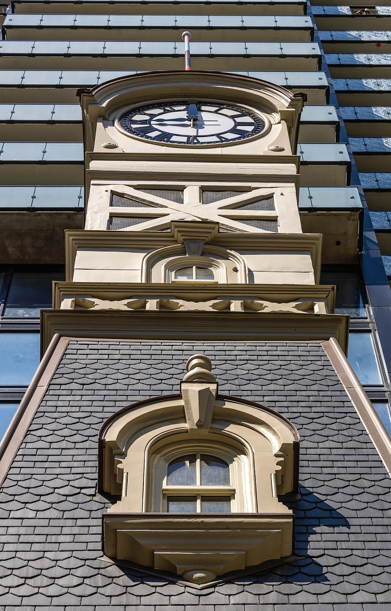 Atwill-Morin restored the heritage envelope, including masonry cleaning, repointing, brick replacement, and precise reproduction of windows and dormers. The company also restored heritage woodwork, undertook slate roof refurbishment with copper finishes, and, for the historic clock, disassembled it, sandblasted the parts, repainted and reinstalled it.