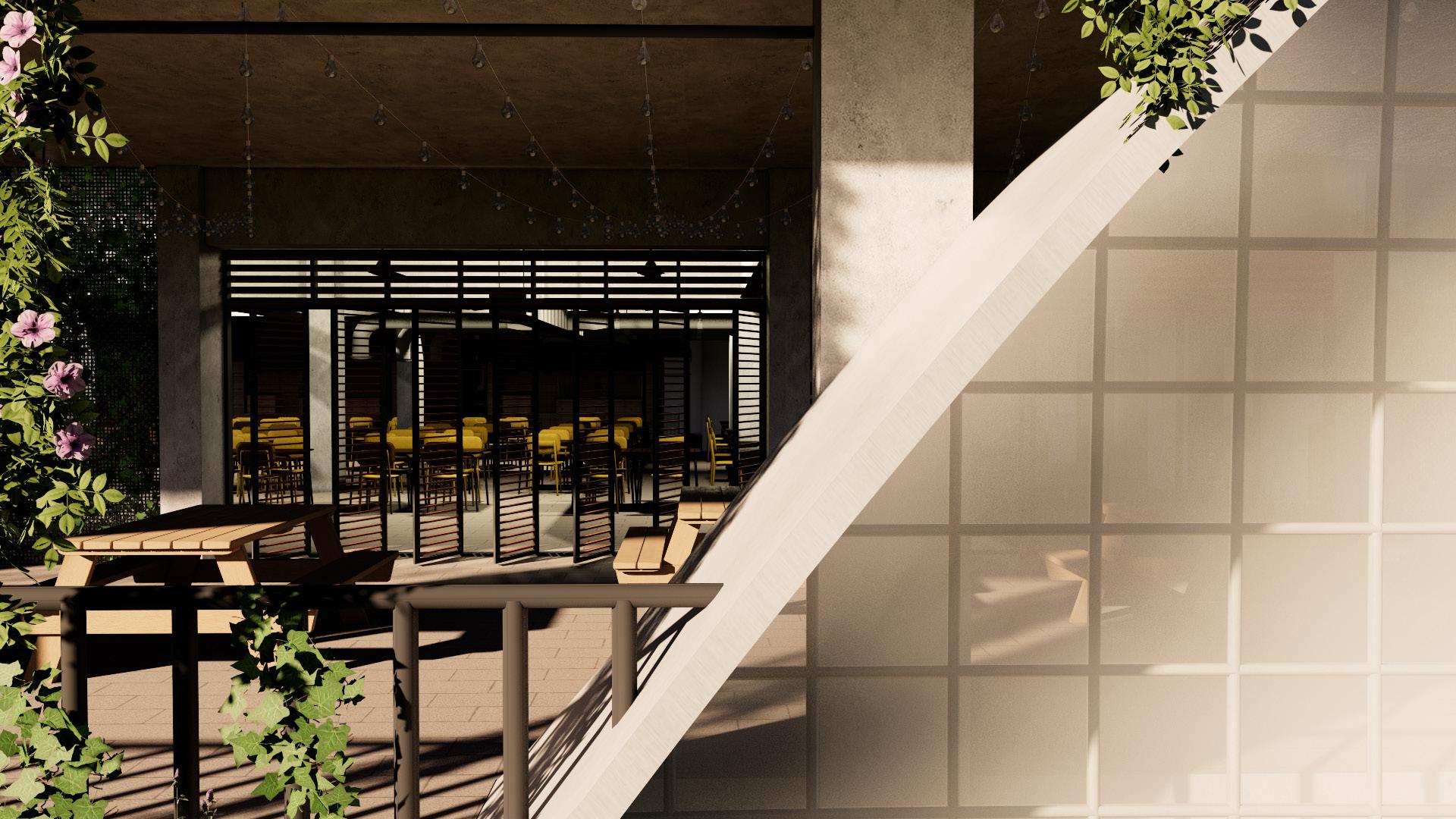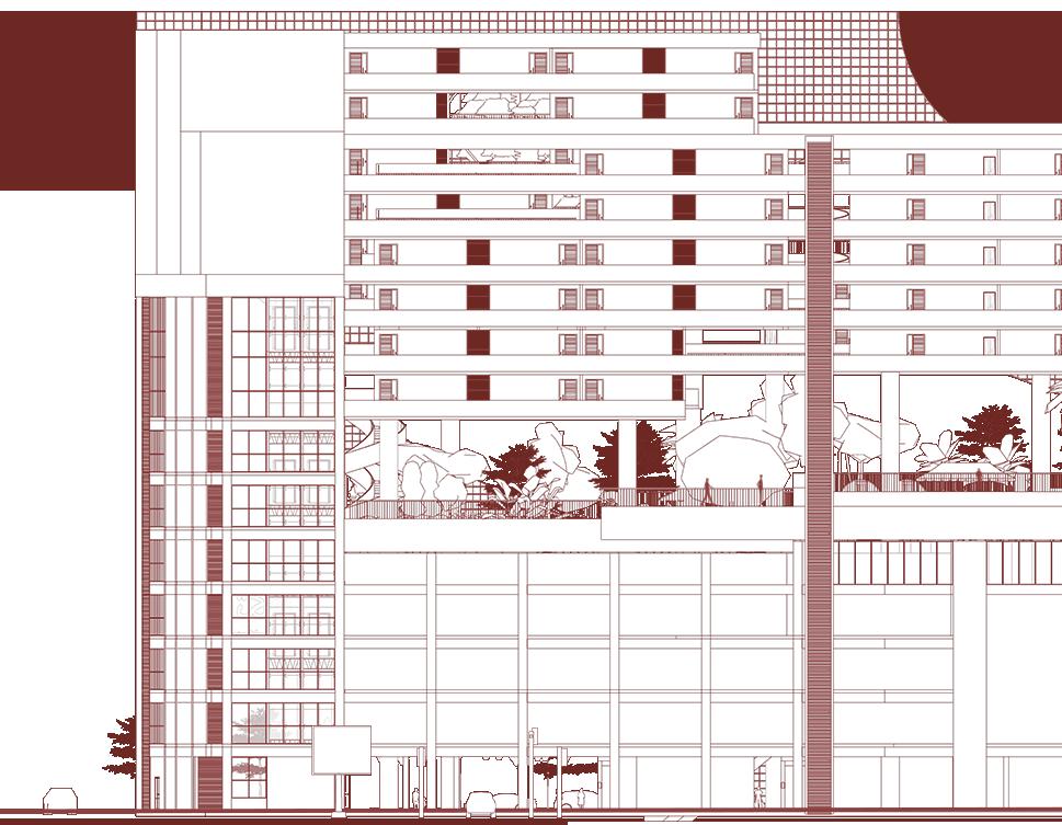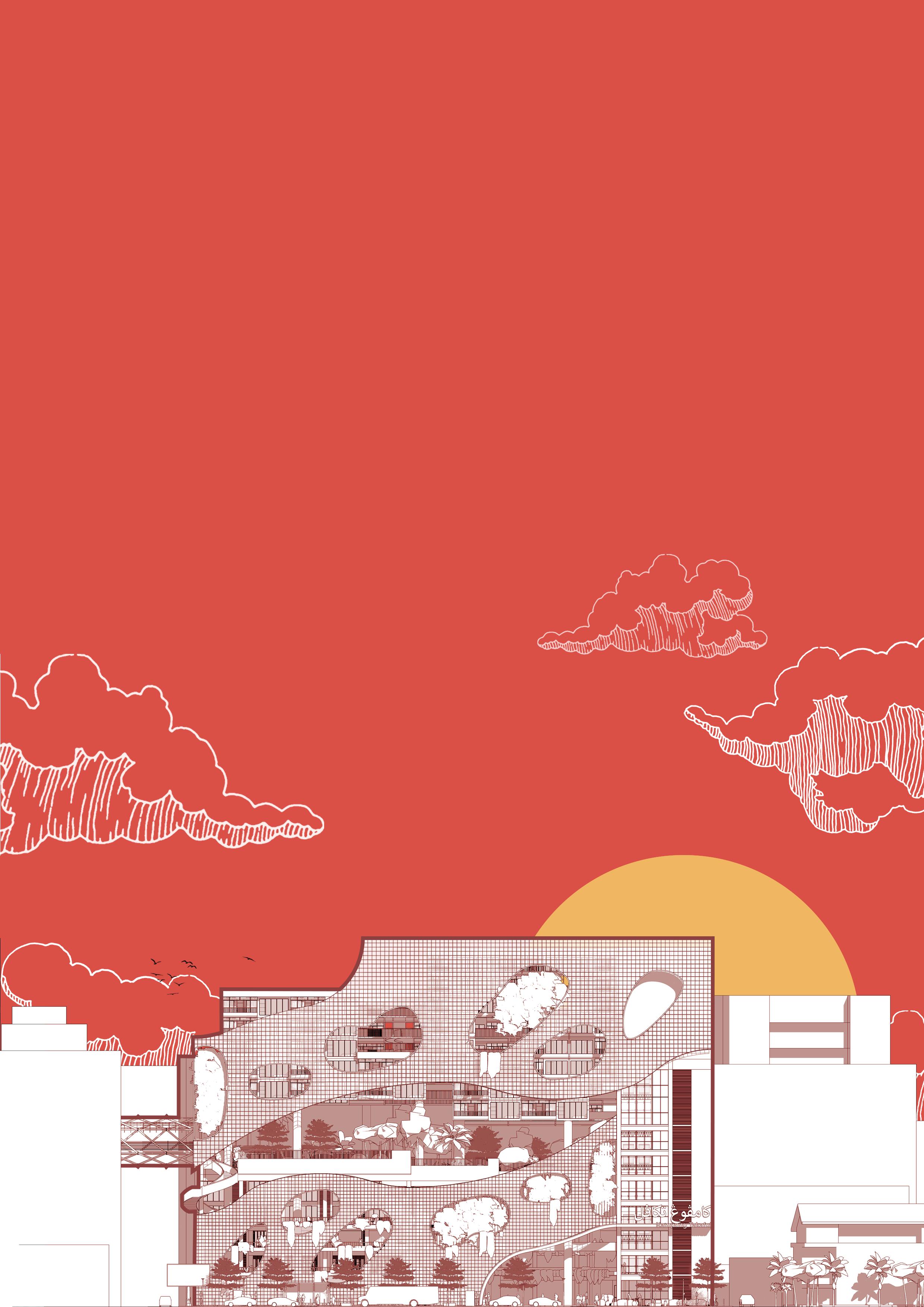 Bearing 2079sqm on Site 1, the superstructure tucks amongst the trees, instituitions and the PMMPMHAMB Hospital allowing nearby patients, students and civilians to conveniently walk-by and unwind. The facade represents a trawl net, eventually torn apart to portray, release.
