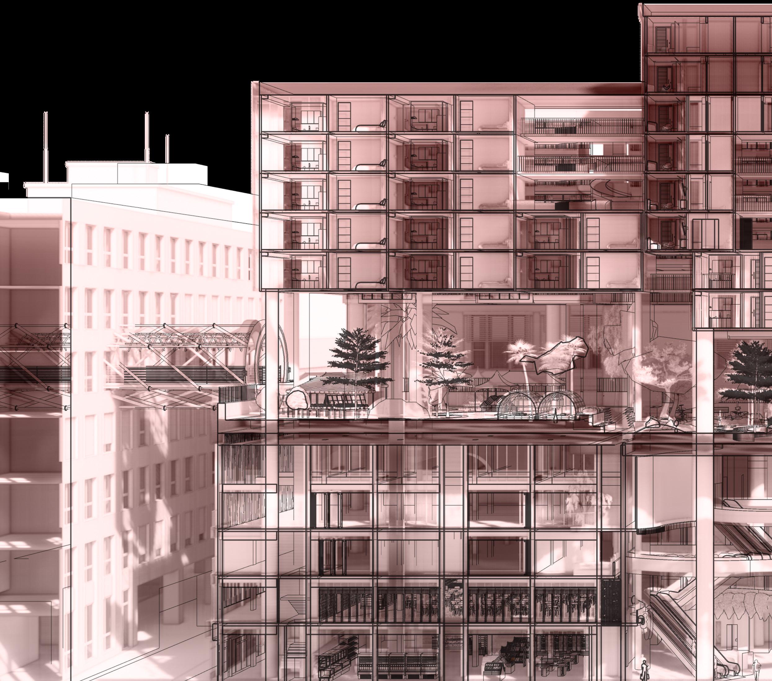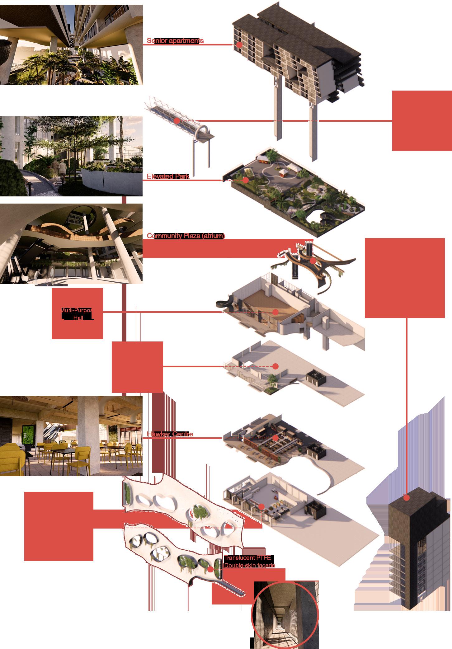 The adapted concept (symbiosis) expresses a similarity between the seemingly neglected elderly and parasitic plants found growing from the crevices of old buildings. Just like the plants, when given a proper host, will thrive. Hence, empowering the elderly through a comprehensive scope of programmes held within the building.