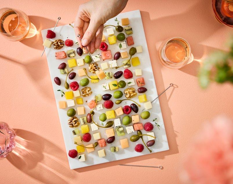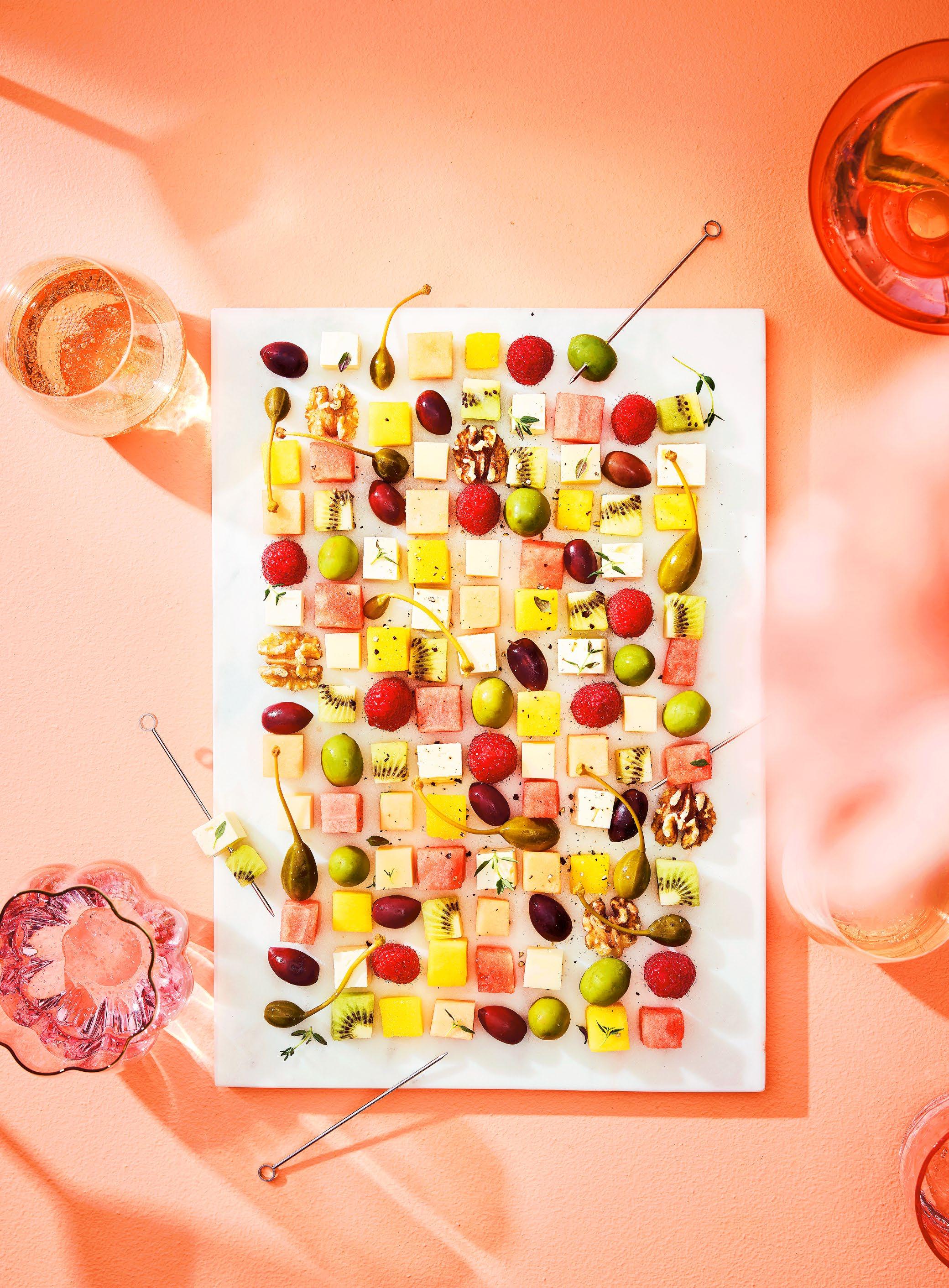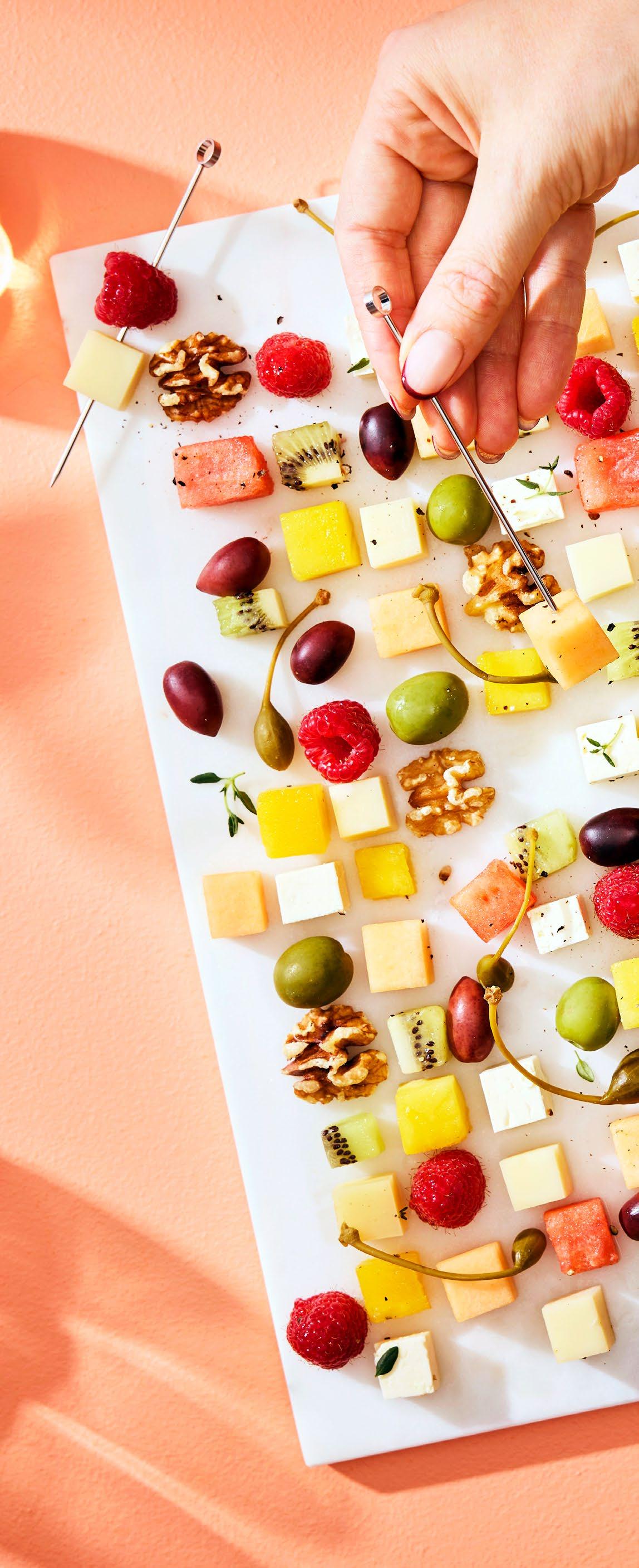 SMÅTT OCH GOTT till brunch, kvällsbjudning eller vårens fester? Stressa inte med serveringen, utan tärna bara frukt och ost i lämpliga bitar.