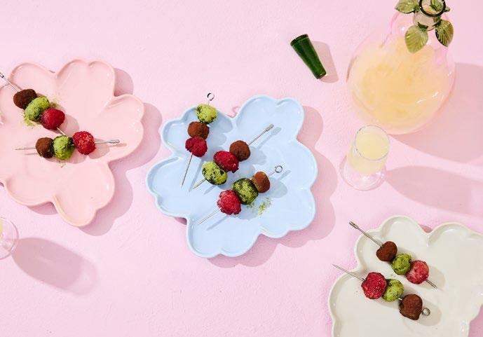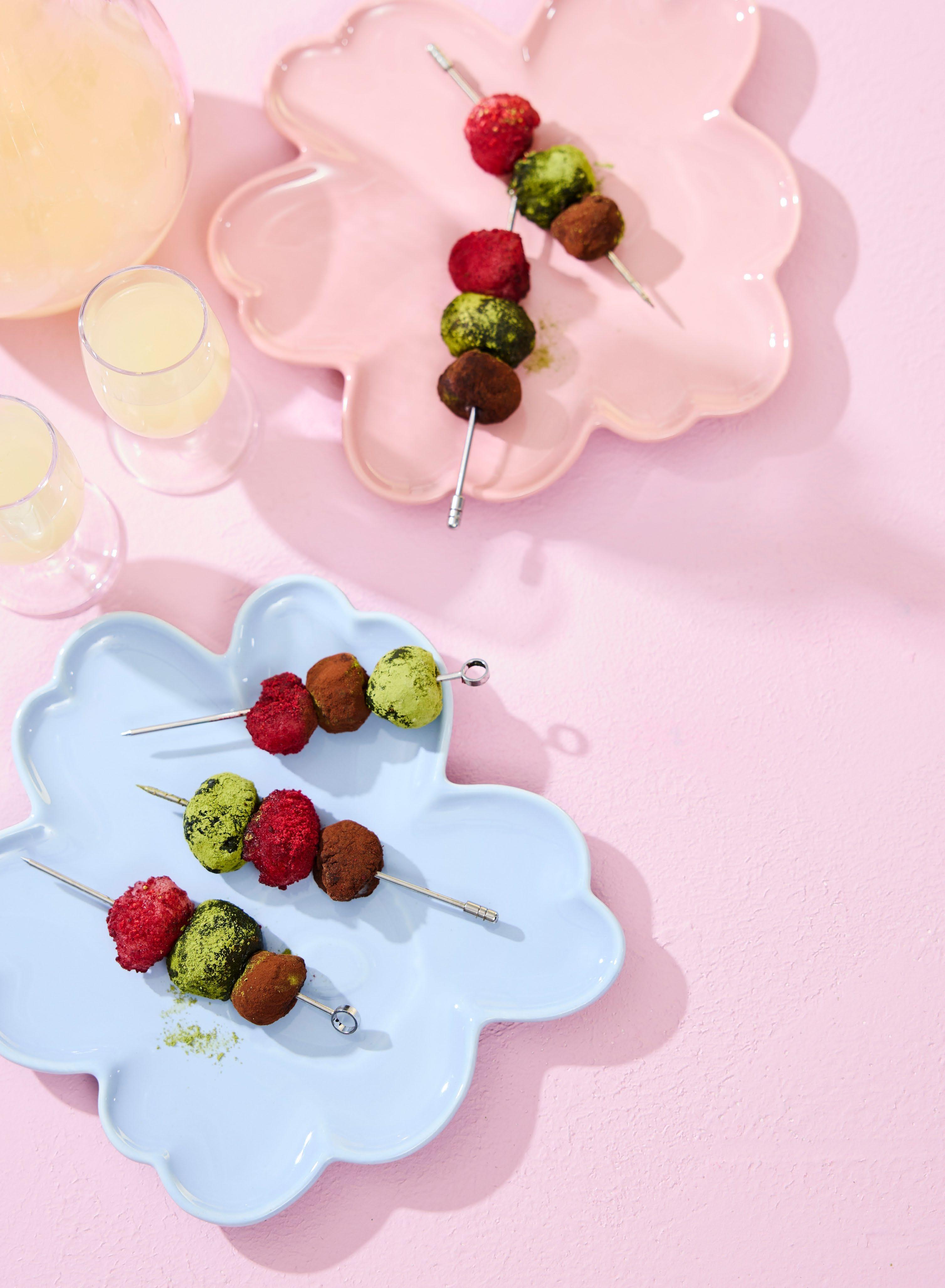 3. Ta fram tre tallrikar. Häll två matskedar florsocker och ett smaksättningspulver på varje tallrik. Blanda. Forma mochimassan till små bollar, lite större än en tesked (ca 24 st), och rulla dem i smaksockret. Trä upp tre bollar på varje cocktailpinne. 4. Avnjut färska eller förvara i kylskåp i en plastpåse.