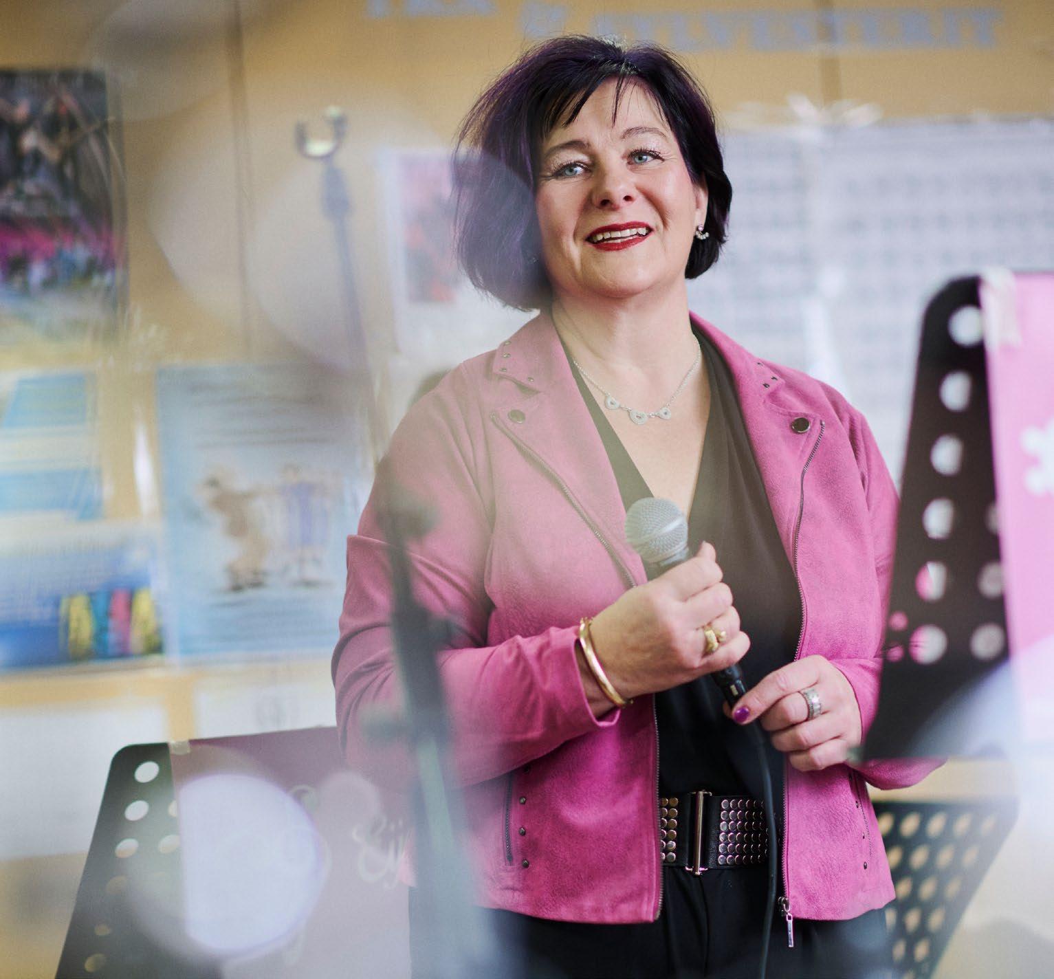 42 Alkoanställd på fritiden. Alkos servicechef Eija-Liisa Majamaa sprider glädje med sång.