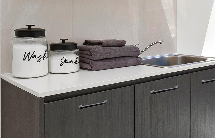 Upgrade 1500mm long laundry unit with laminate top and stainless steel drop-in tub with overflow from builder’s range.