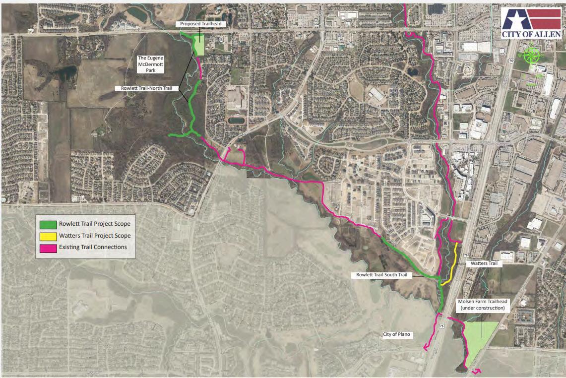 In December 2022, the City of Allen received a $3.2 million grant for the Rowlett Creek Trail, covering segments C2, C4, and C5, as outlined in the City’s 2019 Trails and Bikeways Master Plan.