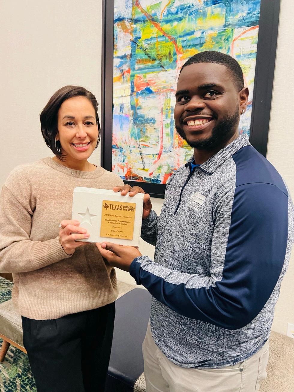 She demonstrated professionalism and generosity by mentoring new staff members, Rezina and Valerie, while also supporting the afternoon with Santa event at Allen Heritage Village. Her innovative approach enhanced the visibility of downtown Allen through festive decorations and creative programming