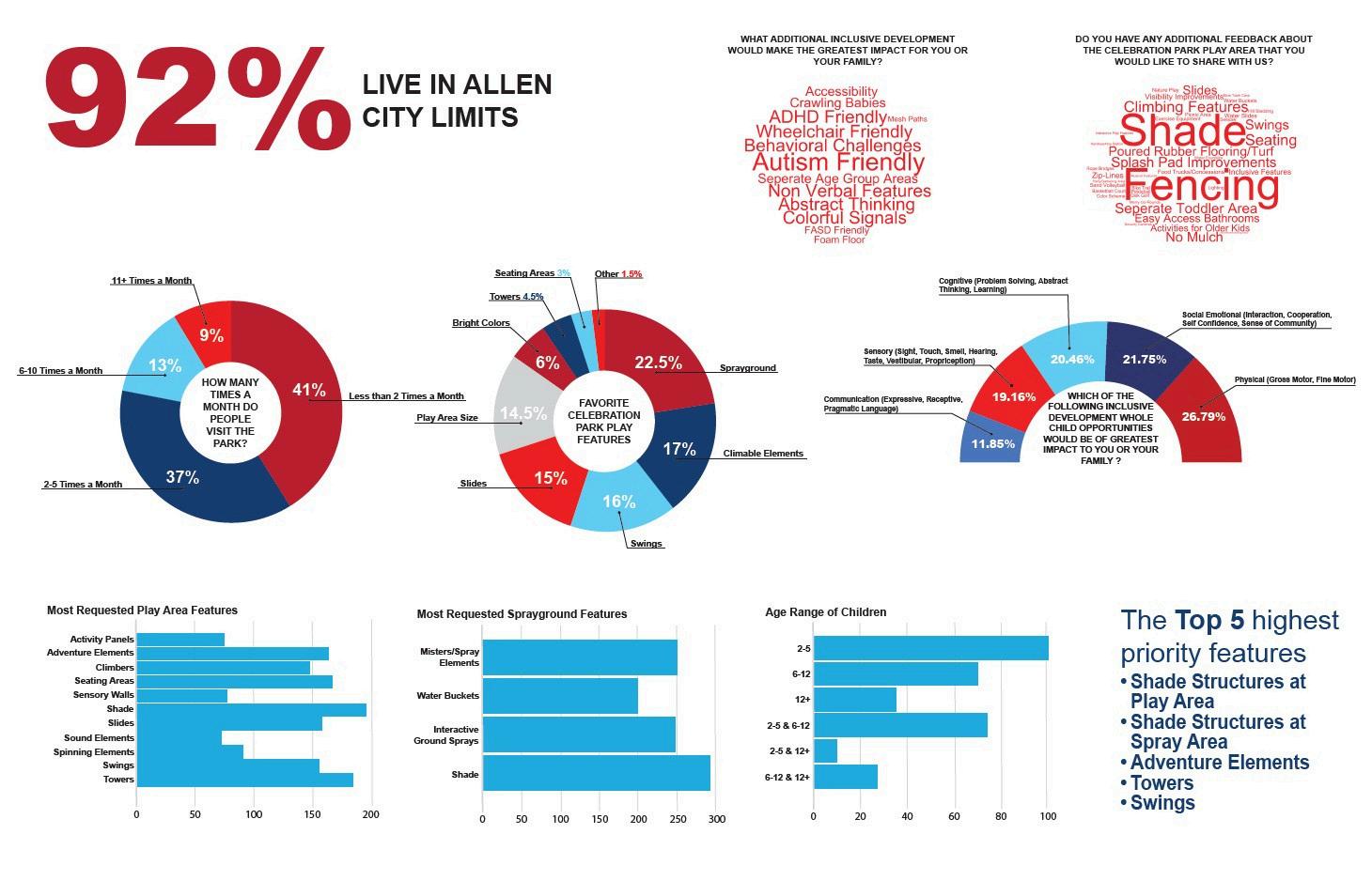 On May 1 , 2025, the public input process began at a community party at Celebration Park hosted by Allen Parks & Recreation There were opportunities to share ideas and input for the park with food st