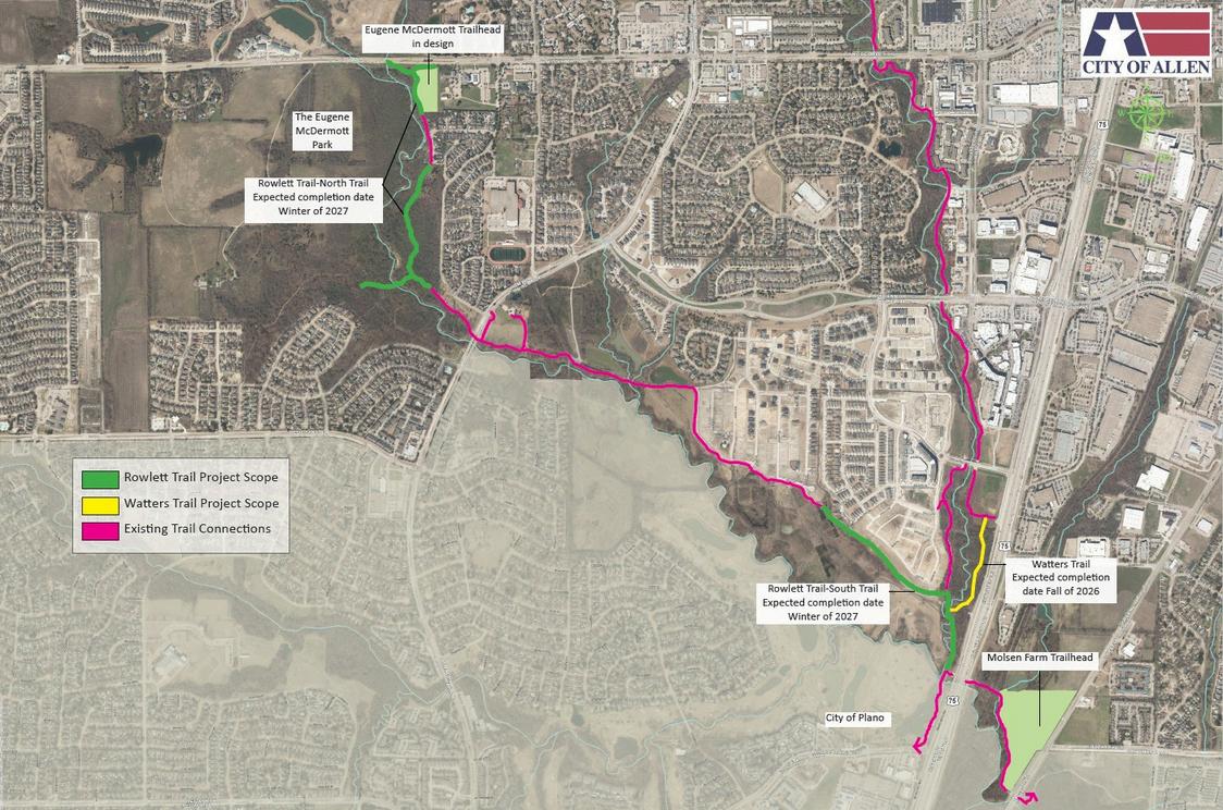Key features include trail renovations through the Watters Creek Commercial District, a pedestrian bridge over a natural drainage corridor, and the use of durable, low-maintenance materials to support long-term sustainability. Upon completion, the extension will integrate seamlessly into the broader Allen and Plano trail networks, enhancing recreational opportunities and promoting active transportation