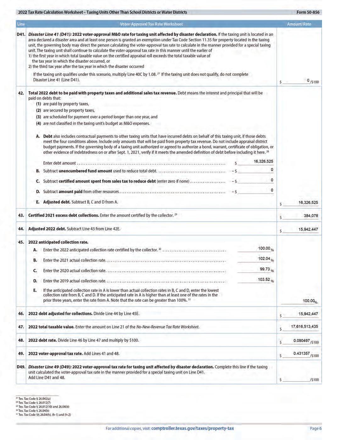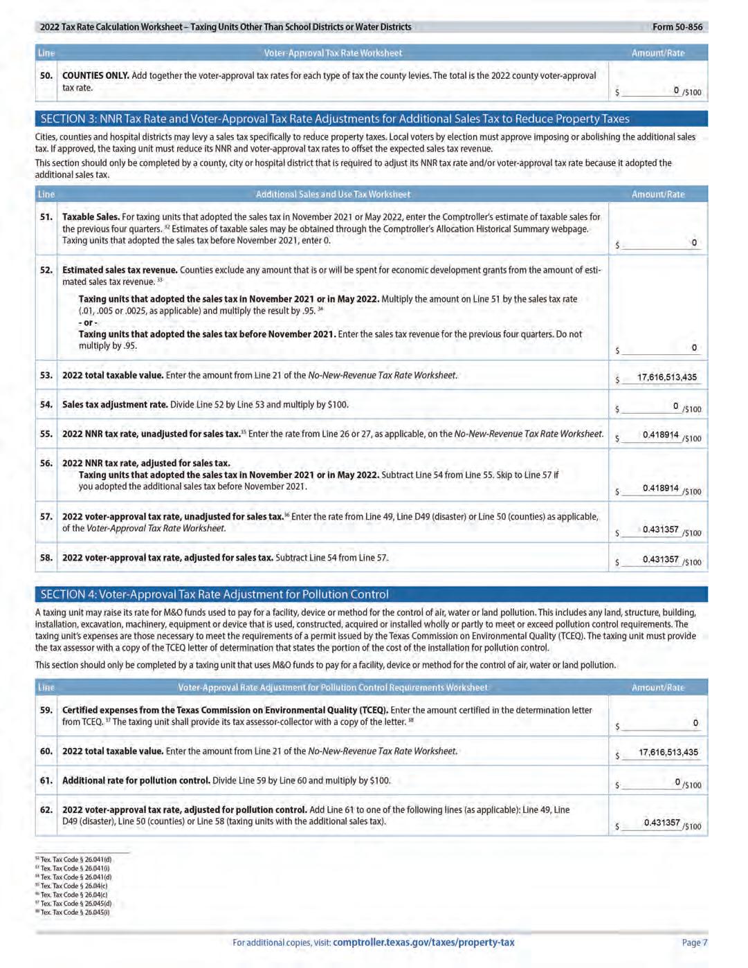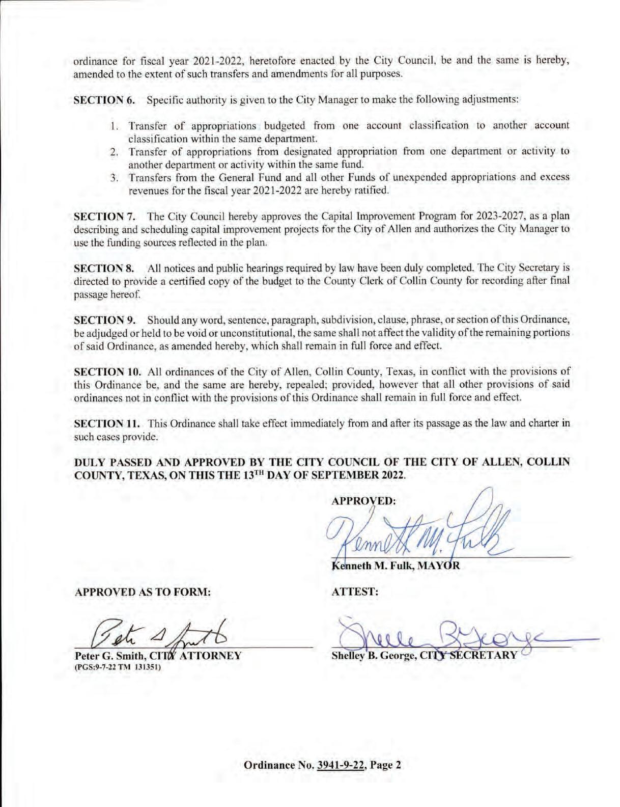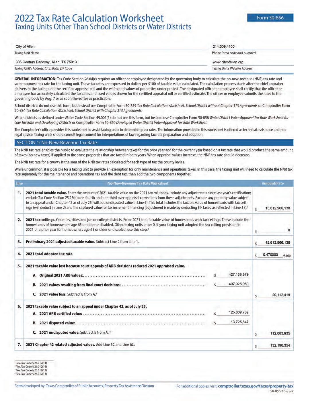Daren Meis, Place No. 1 PRESENT and not voting: None ABSENT: None Property Tax Rate Comparison 2022-2023 2021-2022 Property Tax Rate 0.421200 0.470000 No New Revenue Tax Rate 0.418914 0.470163 No New Revenue Maintenance & Operations 0.328417 0.379298 Voter Approval Tax Rate 0.461959 0.500602 Debt Rate 0.090497 0.101244 Total debt obligations and capital lease obligations for City of Allen secured by property taxes: $119,955,000. 1CITY OF ALLEN, TEXAS | 2022-2023 ANNUAL BUDGET