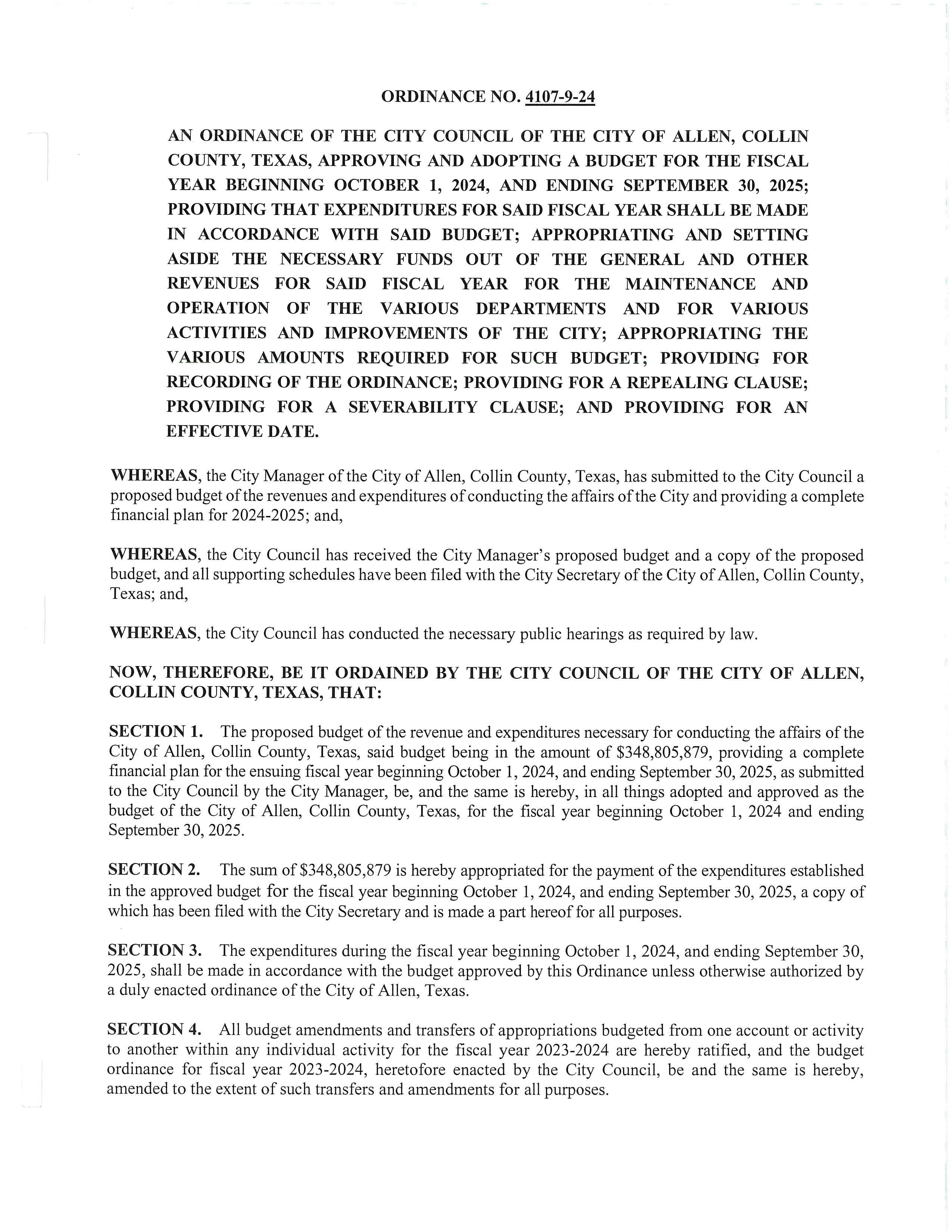This is exactly what you’ll find within the pages of this 2024-2025 City of Allen Budget for Municipal Services. Embedded within the projected revenues and anticipated expenses for the upcoming fiscal year (October 1, 2024 to September 30, 2025) is the story of our amazing community—one known for thoughtful growth, fiscal responsibility and high quality of life.