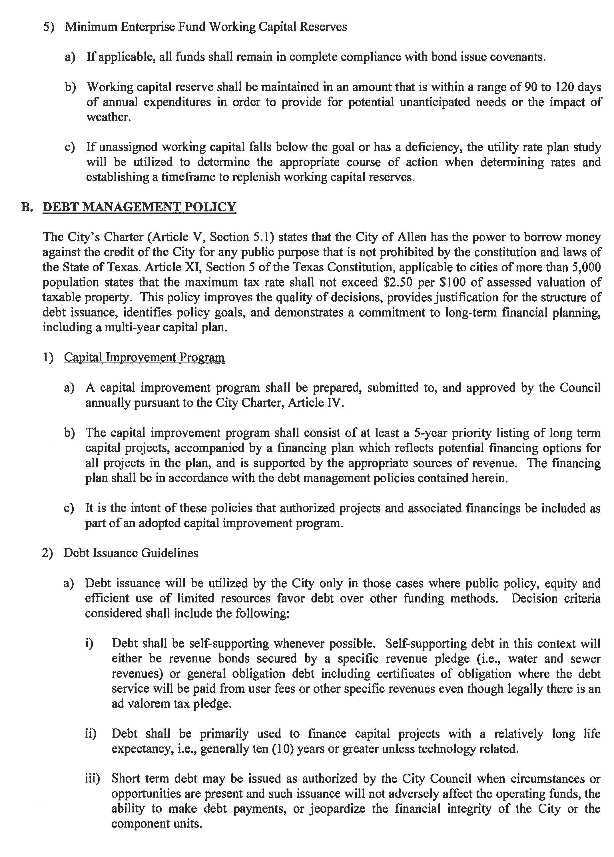 The Tax Cuts and Jobs Act passed by the federal government eliminated the tax-exempt status of advanced refunding bonds issued after December 31, 2017. Advance refunding bonds allowed the City to take advantage of declining interest rates. As a result, the City now issues debt with shorter maturity periods to compensate; however, it comes at a premium. The addition of short-term tax notes, and the upgrade of our debt ratings will have long-term impacts on our interest rates. To control the increase in debt and operating costs the City defers projects as the main management tool. Additionally, a phased in approach may also be used for opening new facilities. To finance public facilities, the City of Allen is also exploring public-private and public-public partnerships.