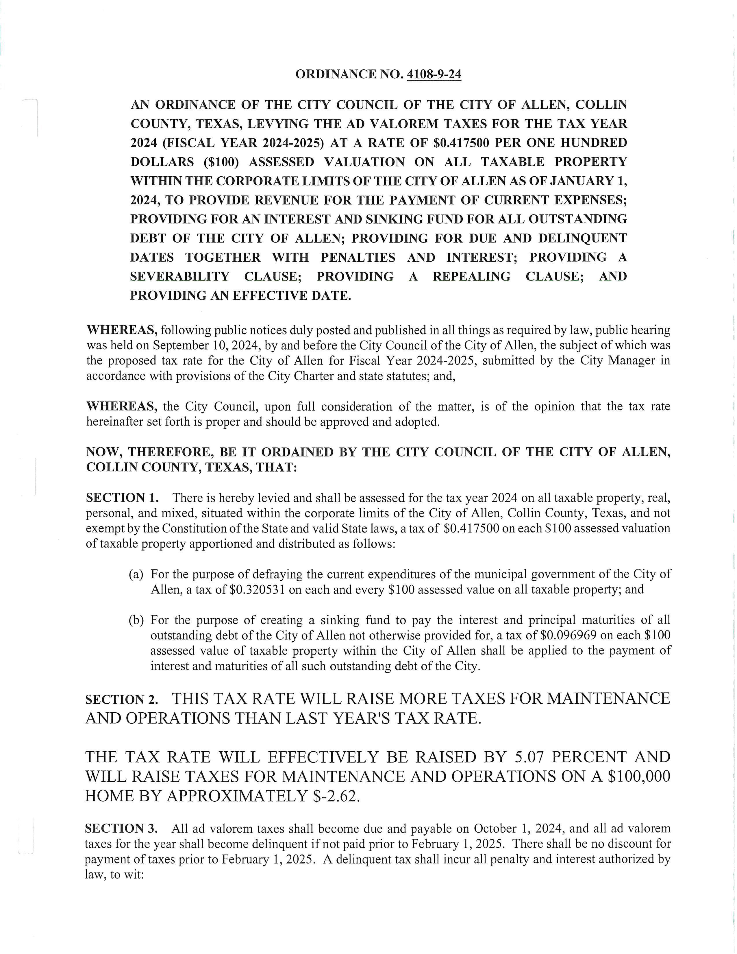 While the City of Allen does not control assessed values of properties, City Council does have the ability to adjust the annual tax rate. This budget proposes a decrease in the City’s tax rate to $0.41750.