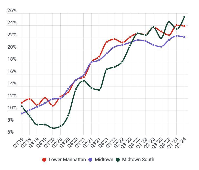 Lower Manhattan vacancy rates remained largely flat in the second quarter. The overall rate improved very slightly compared to Q1, dropping to 24.6%, and only shifted up by 0.4% compared to last year.