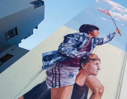 The StreetArt Trail reflects many of Dunedin’s connections with the world, both historicaland contemporary. Phlegmfromthe UK has createda mythical creatureresembling akakapo, and agiant fishswallowing aspects of the city’spast- Māori waka,and European sailing ships.
