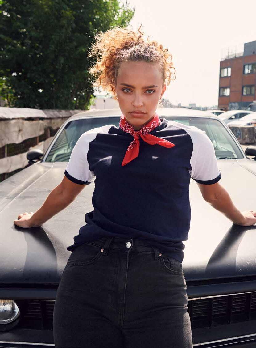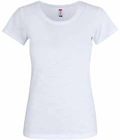 T-shirt in cotone fiammato. Tessuto stabilizzato con trattamento enzimatico. Versione donna con girocollo ampio. Colletto e manica tagliati a vivo e ribattuti. Cuciture laterali. Vestibilità slim-fit.