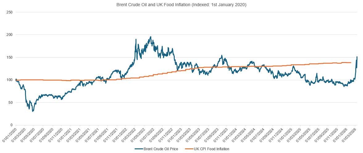 One of the most significant influences on food pricing is the cost of oil. Oil plays a vital role across the entire food supply chain, from fertiliser to food production, refrigeration, and transportation. As a result, there is a strong correlation between movements in global Brent crude oil prices and the cost of food commodities. When oil prices rise, the cost of producing, processing, and transporting food increases, which ultimately feeds through to wholesale and retail pricing.