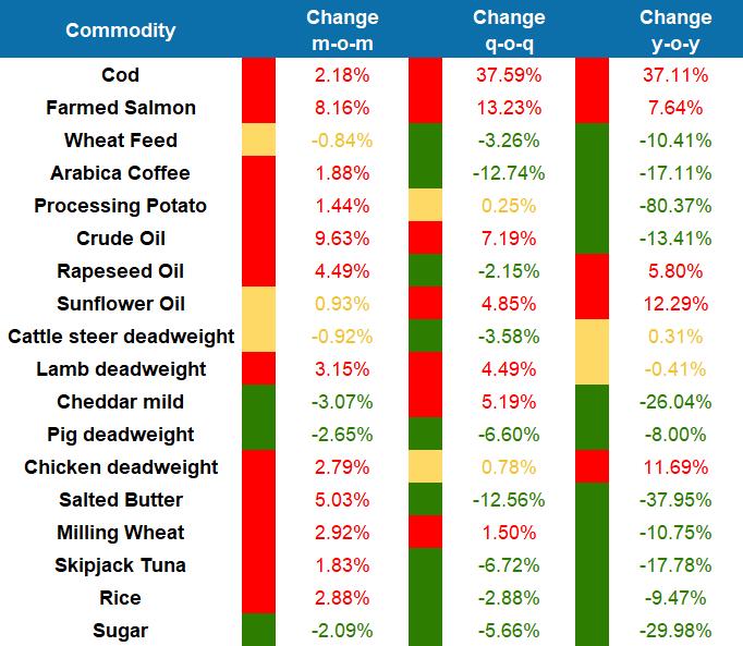 Chicken: Prices have risen by 14% year on year, largely driven by the continued impact of avian Influenza and other poultry diseases affecting major producers across Europe.