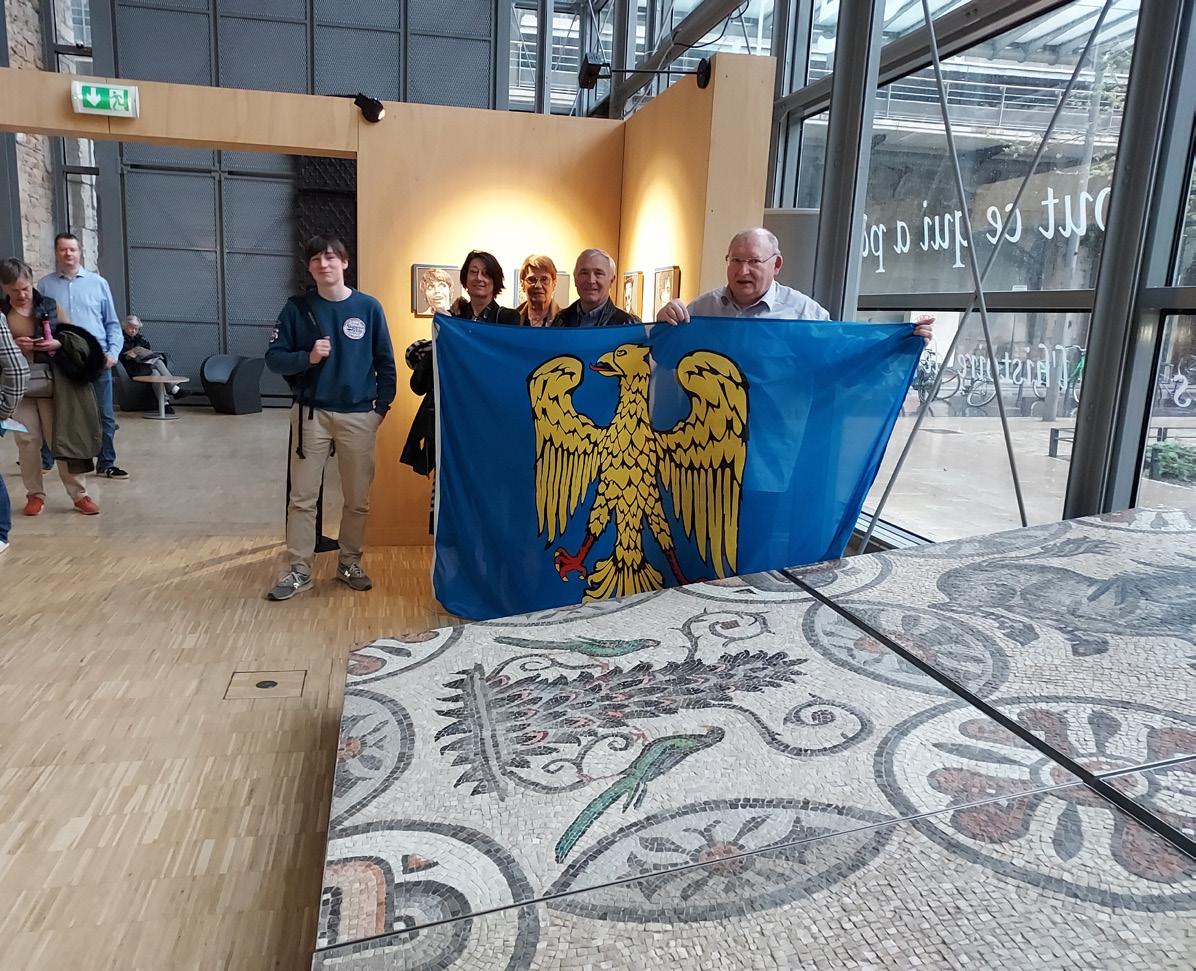 I Friulani si stanno preparando alla Festa ''Nazionale'' Friulana, la bandiera di Bertrando di Saint Geniès si trova accanto ai mosaici di Aquileia, attualmente in bella mostra a Lione.