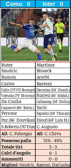Risponde il Como al 49’: occasione sprecata da Alex Valle, che arriva sul cross basso di Vojvoda ma colpisce male, mandando fuori la palla. Superata l’ora di gioco, l’Inter prova a gestire il possesso palla, che però si rivela inconcludente. Negli ultimi 20’, i nerazzurri sono in costante su-