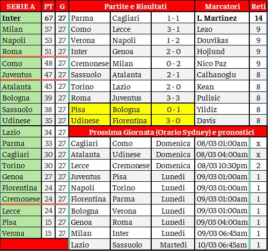troviamo in testa alla classifica il Sydney Utd, club di Bonnyrigg, con lo St George FC subito dietro. Stentano invece le neopromosse: l’SD Raiders e la Uni of NSW, ancora inchiodate all’ultima po-
