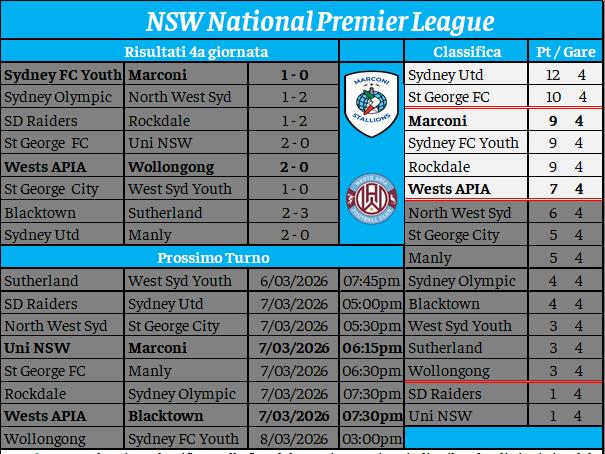 Dopo quattro giornate, la classifica inizia ad avere una sua fisionomia. È ancora presto per parlare di fughe in testa o di squadre in crisi in fondo alla graduatoria, ma si può abbozzare un’analisi non troppo lontana da quella che sarà la situazione con il prosieguo del campionato. Per il Marconi è arrivata la prima sconfitta stagionale, evitabile ma comunque poco compromettente in chiave Top Six. Il club di Bossley Park avrà modo di rifarsi già questo sabato, quando affronterà gli ultimi in classifica, il fanalino di coda University of NSW. Risale invece la graduatoria l’APIA, orfana del suo presidente storico Tony Raciti, dimessosi recentemente. L’undici guidato da Franco Parisi non ha risentito del contraccolpo e ha battuto abbastanza agevolmente il Wollongong sul campo amico del Lambert Park. Un po’ a sorpresa