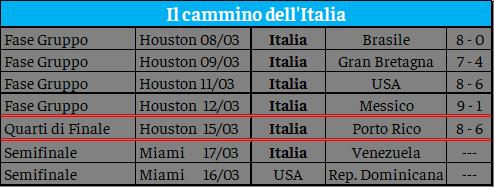 Gli azzurri di Francisco Cervelli (al momento imbattuti) firmano un'altra impresa dopo i successi contro USA e Messico nella prima fase. Gli azzurri sono stati bravi a sventare la rimonta di Portorico da 8-2 a 8-6, chiudendo il conto al nono inning. Merito di Weissert, che ha spento la rimonta dei caraibici. Ora l’Italia del baseball dovrà attendere qualche giorno per una nuova e storica sfida in semifinale contro il Venezuela. È vero, il 90% dei componenti della squadra azzurra sono italiani acquisiti, nati principalmente in America da bisnonni e trisnonni italiani.