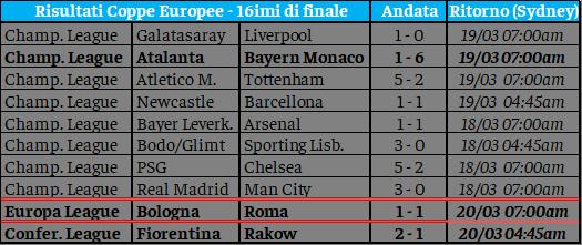 Un risultato veramente desolante: purtroppo, la pochezza dei nostri club è evidente. Schiacciante la superiorità delle avversarie: corsa, fisicità, tecnica, forza mentale e personalità sono solo alcuni dei fattori in cui le squadre italiane risultano inferiori. Si rimane in corsa in Europa League dove, a causa del sorteggio, almeno una italiana tra Roma e Bologna rimarrà in gara. L’anda-