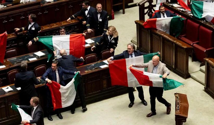 La rissa è scoppiata dopo che il deputato pentastellato aveva provato a portare il tricolore al ministro Calderoli, gesto censurato dal presidente della Camera Lorenzo Fontana con l'espulsione. Diversi deputati lo hanno circondato ed è scoppiata la rissa. La seduta è stata sospesa.