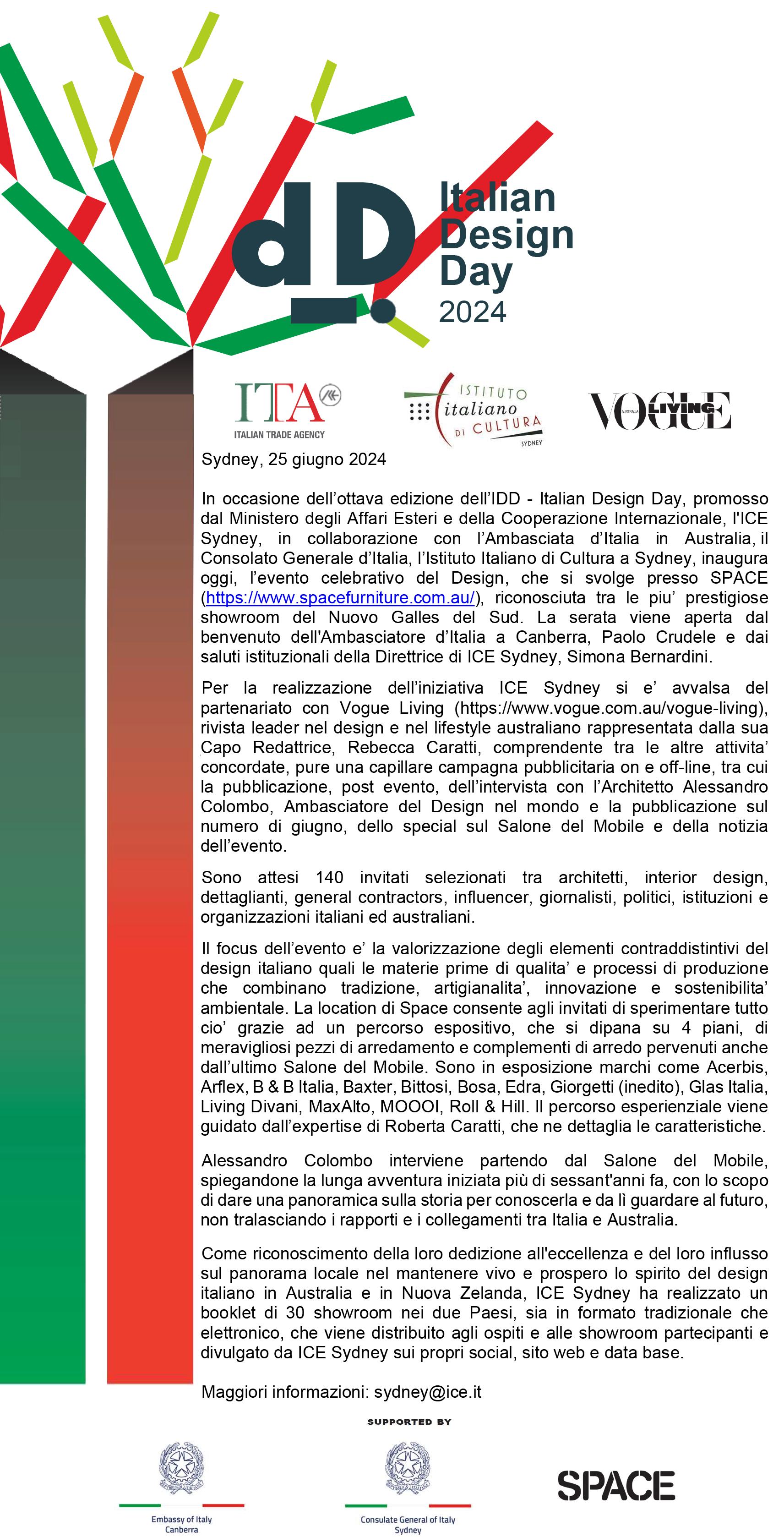 “Il mercato australiano mostra delle opportunità incredibili, alcune poco o non del tutto esplorate, per le nostre imprese in ogni settore di punta del Made in Italy, quali macchinari, prodotti chimico-farmaceutici, apparecchiature elettro-medicali, ottiche, cinematografiche, veicoli auto, aerei, spaziali e relativa componentistica, prodotti in pelle e pelletteria, calzature, bevande ed alimenti, arredamento, complementi di arredo, abbigliamento. Se guardiamo al valore delle importazioni australiane dall’Italia, che nel 2023 si è attestato a 5,9 miliardi di Euro su un totale di 254.1 miliardi di Euro, ci possiamo immediatamente rendere conto che la nostra quota di mercato è solamente del 2.32%. I margini quindi di incremento dell’export italiano sono notevoli.”