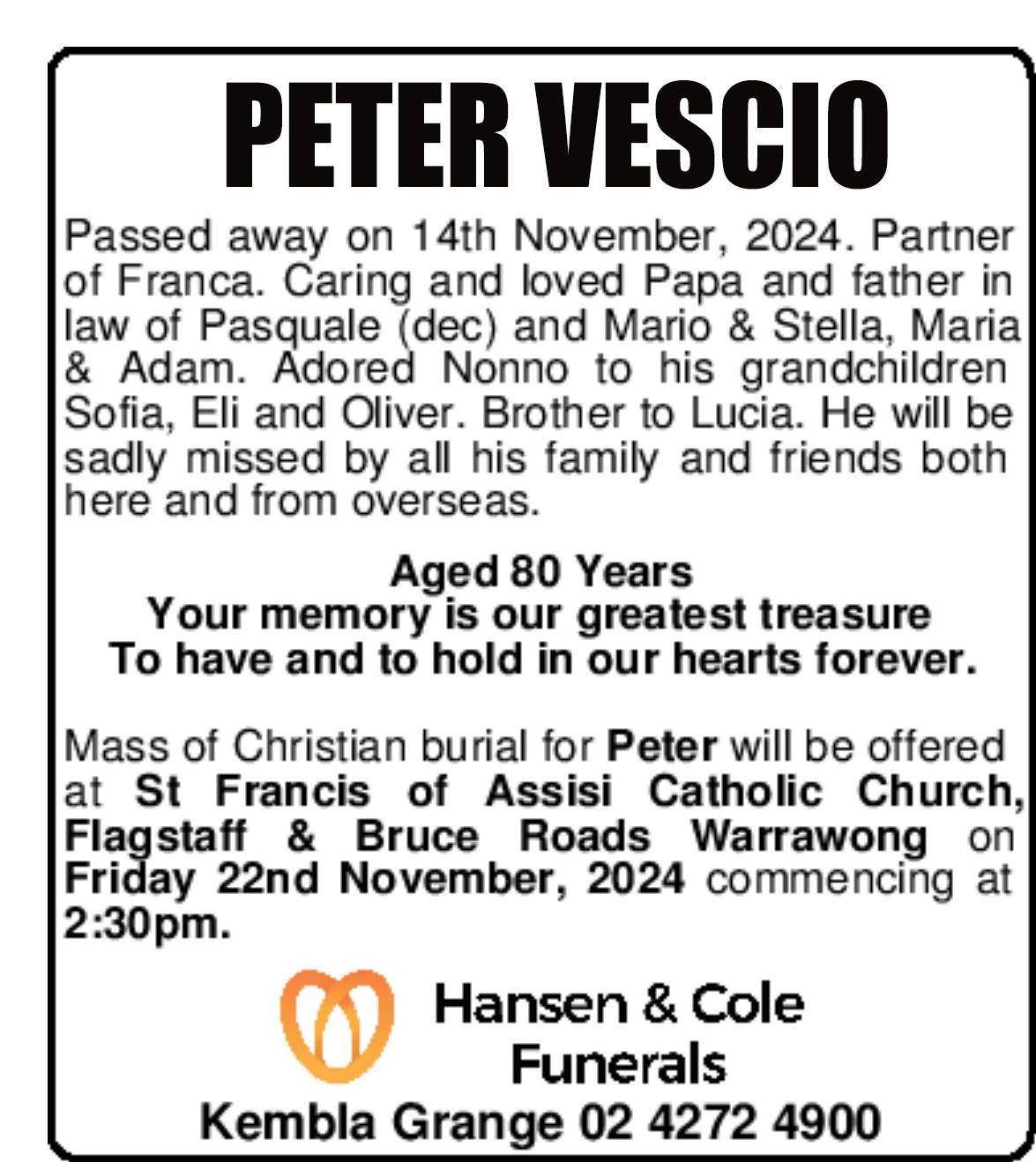 Caro e amato marito di Pasqua Vittoria (defunta), ad un mese dalla sua scomparsa, i figli Germano, Antonietta, Bruno, Roberto e Anthony,le nuore Kylie, Katie,e Julie, i nipoti Jayden,Emma, Michael,e Lexie,parenti ed amici vicini e lontani in Australia e Italia lo ricordano con dolore e immutato affetto. Il funerale e’ stato celebrato giovedi’ 24 ottobre 2024 alle ore 11.00 nella chiesa di Our Lady of Victories 1888 The horsley Drive, Horsley Park. Le spoglie del caro congiunto riposano nel cimitero di Pinegrove Memorial Park, Great Western Highway, Minchinbury. I familiari ringraziano tutti coloro che hanno partecipato al loro dolore e al funerale del caro estinto. “ I ricordi sono eterni, così come l'amore che porti con te."