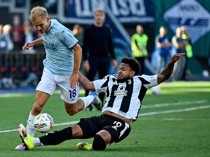 Dopo un primo tempo equilibrato e terminato 0-0, in cui le due squadre hanno offerto ottimi spunti di possesso palla, ma creato poche occasioni importanti, la musica cambia nella ripresa, con ritmi più veloci e molte occasioni. Al 51' la Juventus passa in vantaggio con il cross di McKennie per Kolo Muani, che di testa insacca sul secondo palo. Dopo 9', però, i bianconeri rimangono in 10 uomini per l'espulsione diretta di Kalulu. Finale per cuori forti: miracolo di Di Gregorio al 93' ma poco prima, il var annulla un rigore concesso alla Lazio per fuorigioco di Castellanos. Ammonizioni a raffica per i laziali che al 96', si portano sul pari: altra grande parata di Di Gregorio sul colpo di testa di Castellanos, ma il portiere non può nulla sul tap-in di Vecino.