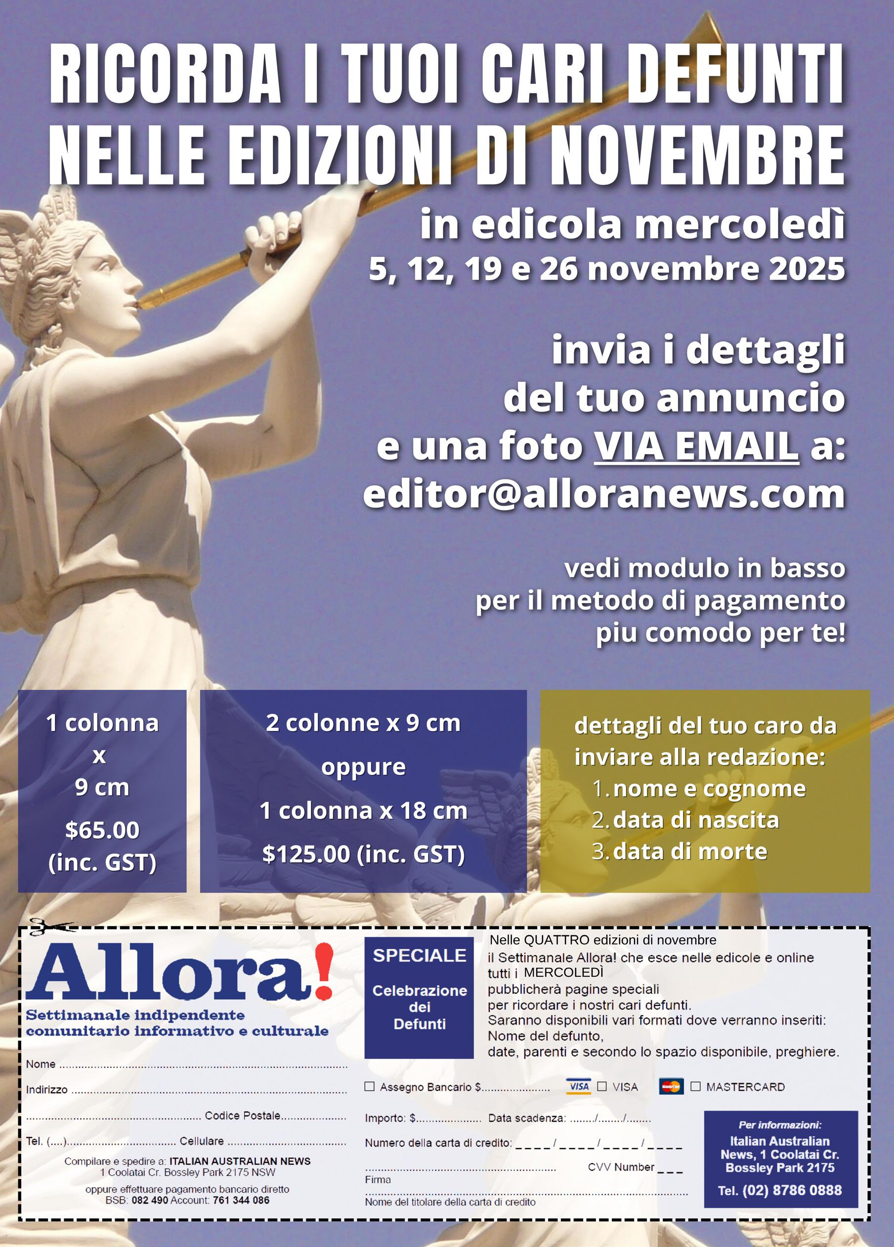 Il santo rosario sarà recitato oggi, mercoledì 3 settembre 2025 alle ore 17.00 nella chiesa di St Mary, 56 Burton Street, Concord. Il funerale sarà celebrato giovedì 4 settembre 2025 alle ore 12.00 nella stessa chiesa. Dopo il rito religioso il corteo funebre proseguirà per la sepoltura nel Cimitero Cattolico di Rookwood. “Andata ma non dimenticata.”