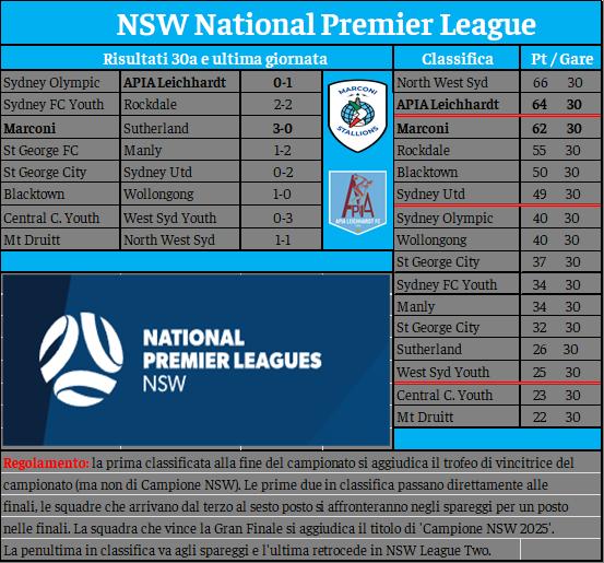 Marcatori: 9’ Duricic, 32’ Swibel, 34’ Busek Bossley Park – Il Marconi con un primo tempo travolgente batte il Sutherland, conquista con pieno merito il terzo posto in classifica e si appresta a disputare i play-offs per l’assegnazione del titolo di Campioni del NSW. Prossimo avversario il Sydney Utd questo mercoledi sera con orario ancora da stabilire.