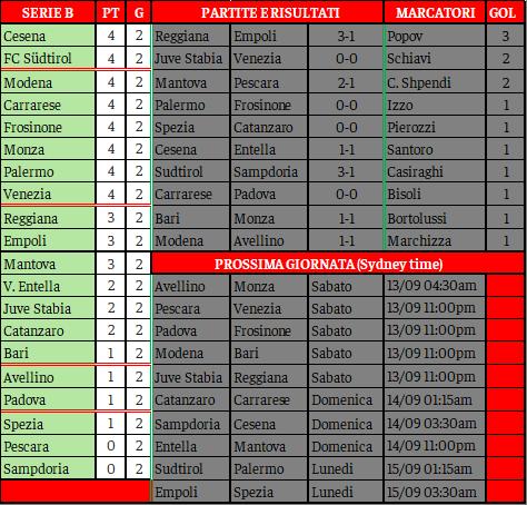 Nessuna squadra a punteggio pieno dopo due giornate, Pescara ancora a zero punti