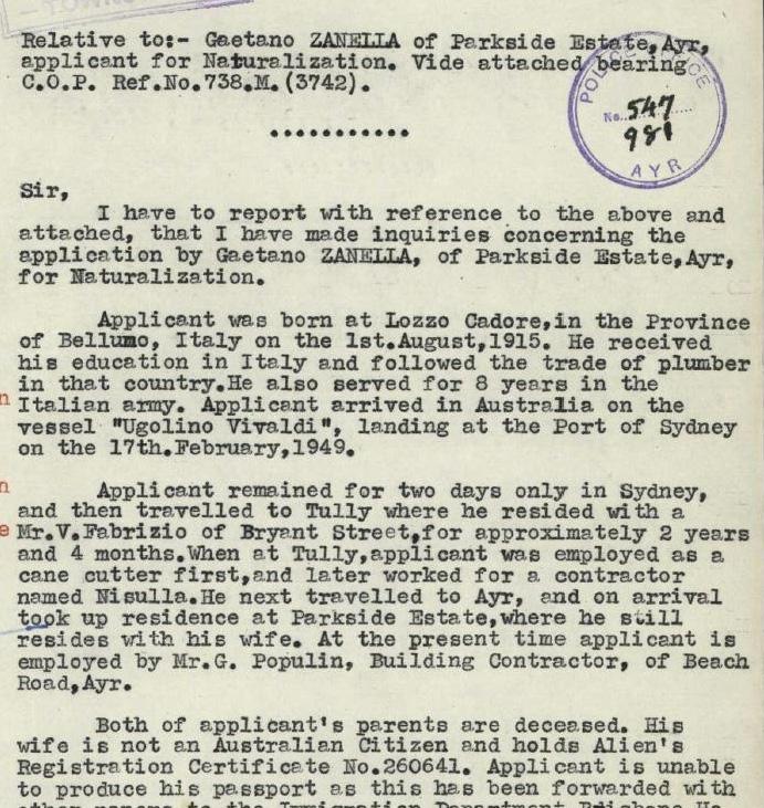 cited by the senator was a letter from a Townsville police inspector noting Zanella’s command of English and ability to integrate into an English-speaking community, concluding he would have “no difficulty” adapting to life in Australia.