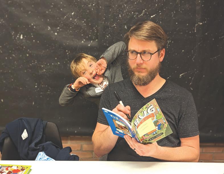 Photos by Emily Gibson Mike Lowery has illustrated more than 80 children’s books, including “The Gingerbread Man Loose in the School” by Laura Murray. Above, Lochlan Murray (no relation to Laura of which we are aware) pulls a face for the camera as Lowery autographs a book.
