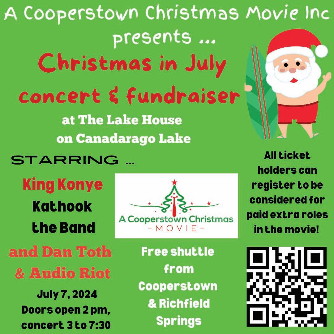 CONCERT FUNDRAISER 3 p.m., doors open at 2 p.m. “Christmas in July” concert and fundraiser for the movie, “A Cooperstown Christmas.” Performers include King Konye, Kathook the Band, and Dan Toth/Audio Riot. Tickets are $25.00; limited number are available. All ticket holders can register to be extras in the film, a Hallmark-like romantic comedy. The Lake House Restaurant & Lodge, 2521 County Hwy. 22, Richfield Springs.