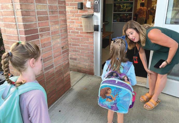 COOPERSTOWN—Eleanor Spencer is greeted by Cooperstown Elementary School Principal Amy Malcuria on her first day of school as sister Meadow looks on. CCS students returned to school on Thursday, September 7.