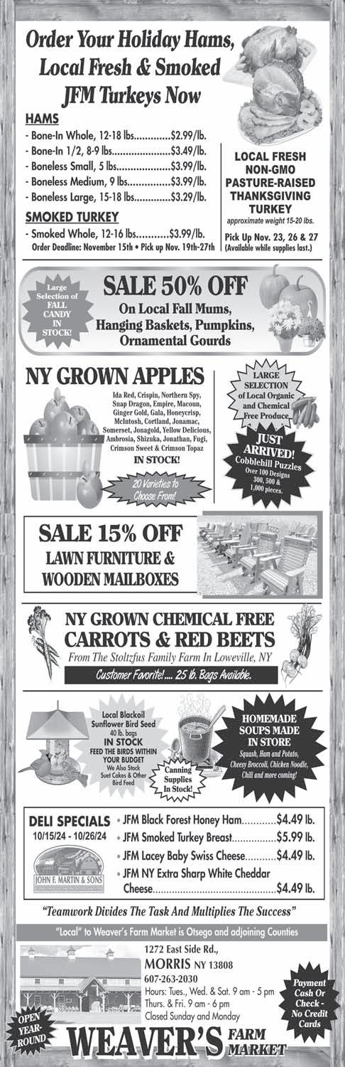 FUNDRAISER 10 a.m. to 2 p.m. “Harvest Lunch, Craft Corner and Bake Sale.” Church of Christ Uniting, 22 Church Street, Richfield Springs. (315) 858-1553.