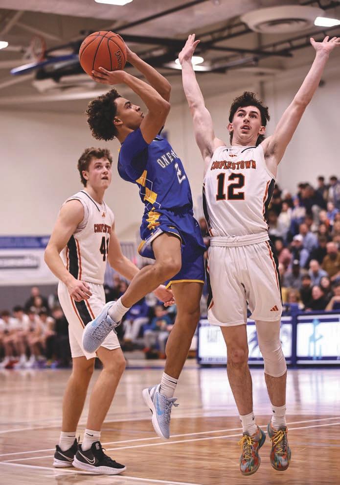 Oneonta’s Maddox Imperato takes the jumper over Cooperstown’s Cooper Coleman. The Hawkeyes defeated the Yellowjackets, 66-55.
