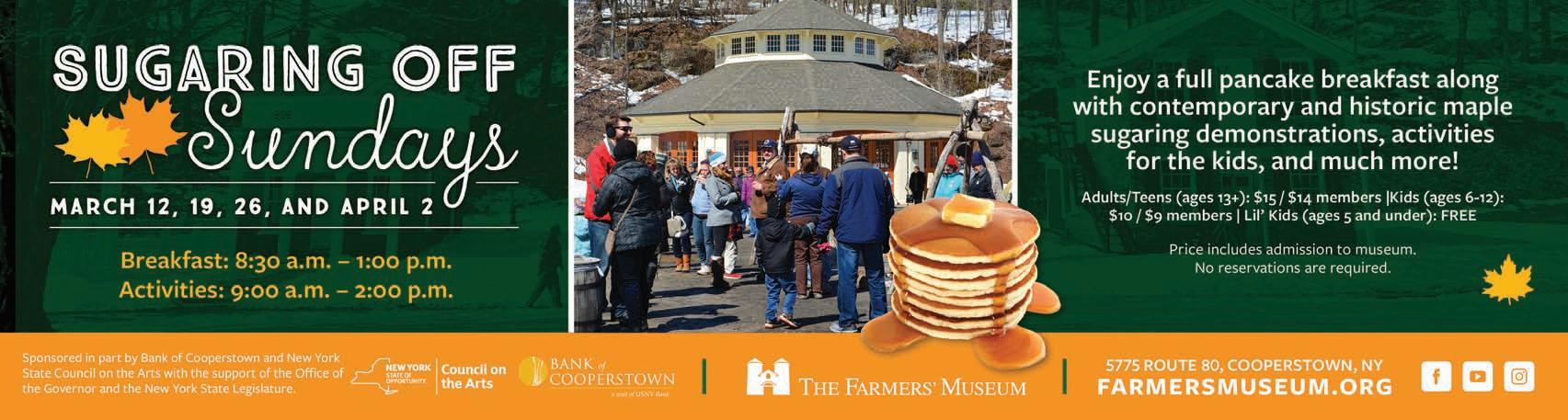 SUGARING OFF 8:30 a.m. to 2 p.m. Enjoy a full pancake breakfast in the morning then contemporary, historic demonstrations of maple sugar production. Admission, $10/adult. The Farmers’ Museum, Cooperstown. (607) 547-1450.