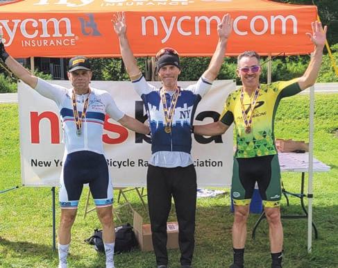 Photo provided Cooperstown’s Brian White enjoys his time atop the podium after winning the Masters Men 55-59 NYSBRA Time Trial. White is flanked by second-place finisher Ronald Malone of Long Beach (left) and Michael Morris of Manlius, who finished third.