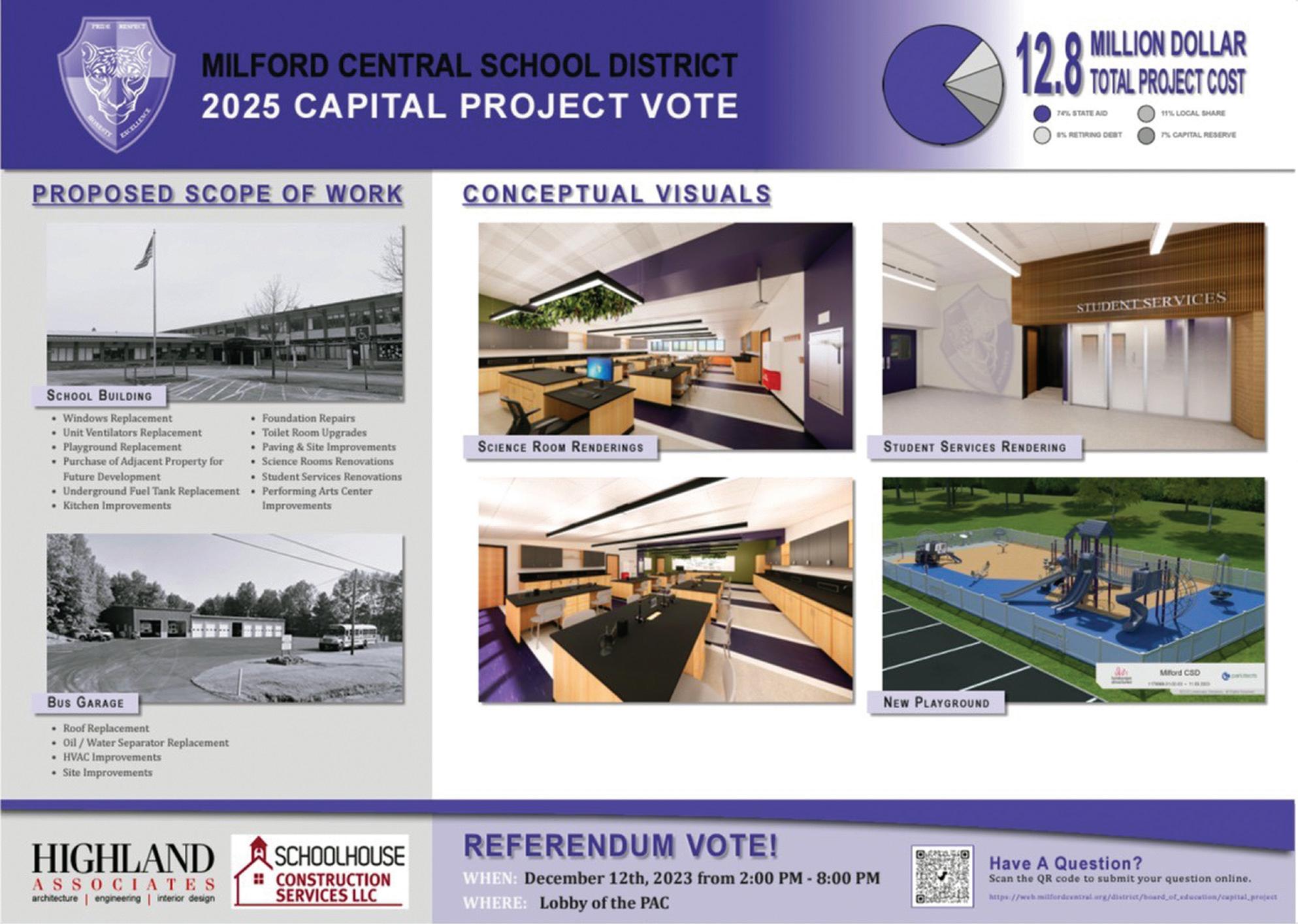 The display used to market the Milford Central School District capital project, above, outlines the scope of work residents voted to approve by a slim margin in December 2023.
