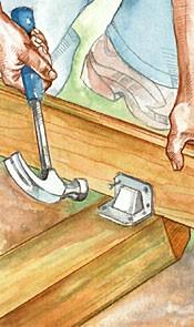 Secure the joists to the outer skids with angles. Drive hanger nails into the joists and 16d nails into the skids.